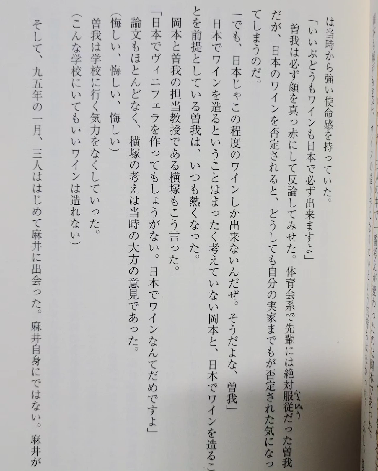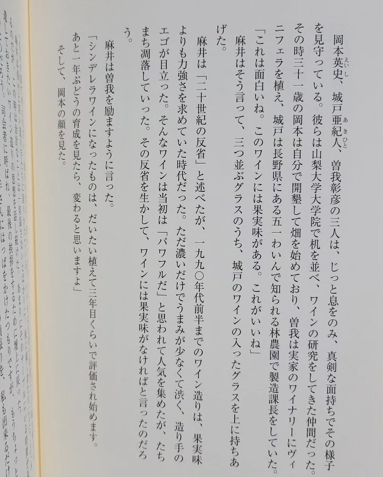 일본은 식용포도로 포도주를 만들거나 대부분은 저렴한 수입원료 ( 농축과즙, 벌크와인, 생과즙 의 방식으로) 로 일본내서 제조해 만든 단맛의 혼성주를 '국산와인'으로 팔아왔다. 아사이 선생은 소비자를 속여선 안되고 일본도 제대로 양조용포도부터 재배해야 한다고 주장했다. 또한 교과서를 따르지 마라, 직접 느끼고 스스로 생각해라라고 이야기 했다. 우스케보이즈3인은 야마나시대학 양조 대학원에서 만난 와인 모임멤버였다. 블라인드로 항상 좋은 품질의 브루고뉴 보르도등의 와인을 마시며 어떻게 만들어질까에 대한 이야기로 불타오르던 청년들이었다. 당시 큰 호평을 받은 아사이우스케 선생의 샤또메르시앙에서 만든' 키쿄가하라桔梗ヶ原 메를로' 를 블라인드로 마시고 일본에서 이런와인이 가능하다고? 놀라게 된다. 브루고뉴 와이너리 여행을 수십개의 편지를 보내놓고 미국을 경유해 가는 가난한 배낭여행을 함께 하기도 했다. 가장 놀란건 지금 보페이사쥬의 위치는 체감상 최고난이도로 접하기 어려워 느껴지는 신비로움과 귀공자같은 아우라가 있는데 반대로 생산자 오카모토상의 히스토리가 정말 처절했기 때문... 게다가 오카모토 자신도 소가 아키히로 에게 '일본에서 와인만든다는건 바보야. 일본에서 좋은 포도가 나올수가 없으니까. 와이너리를 한다면 캘리포니아에서 만들고 그걸 운송해와서 항구가까이에서 만들어야되' 라고 주장했던 사람이라는 ..그럼 소가상은 자신은 본가와이너리가 부정당하는 느낌에 얼굴을 붉히며 반론하곤 했다고..ㅎ하지만 대학원 교수님조차 비니페라종을 재배해도 일본에서 와인이라니 안되라고 했었다는.. ! 오카모토상은 처음엔 아내와 동료들 4이서 시작했지만 밭임대, 대출조차 조사공무원이 여기서 포도 재배는 안될거라며 심사해 받을 수 없었고 그런 시간동안 못견딘 동료 둘은 안좋게 떠났다. 포도를 심고서도 자라는 몇년은 수입을 기대할 수 없었으니 혈연지연도 없는 야마나시에서 아내와 문화유적발굴 아르바이트로 근근히 식비만 충당했고 생활고등으로 지친 아내도 2년반만에 이혼을 하고 떠나갔다. 그때는 와인도 팔리지않고 레스토랑에 영업을 가면 두고가세요 라고 문전박대를 받기도 했다.. 같은 해에 아사이선생이 돌아가시기도 했다. 오카모토상은 혼자가되어 아침부터 늦은 밤까지 포도 하나하나를 살피고 보살피는 것에만 몰두한다. 2002년부터 4년은 외부사람도 받지않고 소수의 사람들하고만 대화했으며 오직 자연과 마주할 뿐이었다. 아사이우스케 선생의 책만 공부할 뿐이었다. 그때부터 그의 양조가 바뀌고 평가가 좋아졌다. 그러면서 깨달은 와인맛은 포도에게 맡길뿐, 자연은 나쁜것도 좋은것도 없고 토지의 있는 그대로를 표현하고 싶다는 것. 농약, 아황산염 일절 무첨가로 수확량은 놀랄정도로 적은 양으로, 아주 조용히 작업하며 원시적인 방식으로 스텐 체위에 포도를 굴려 열매를 분리하고 고대문헌을 보고 만든 나무재질의 작은 손 압착기를 쓴다 병입은 낙차를 이용한 사이폰방식으로 천천히 1병에 1분정도씩 걸린다,, 수도물에는 염소를 제거해쓰거나 세척용은 반드시 우물 물을 쓰는등 상상이상으로 손이 많이가는 일들을 하고있다. 3인은 각자 다를 환경에서 비니페라종 재배와 양조에 도전과 실패, 기상이변 통해 '숙명적풍토론'에 대해 애초에 포도재배에 적합지가 정해져있는게 아니고 좋은 포도가 만들어지면 와인품질이 인정받으면 거기가 적합지로 인정받는 것이 아닐까 생각하며 자연을 믿고 스스로 개척해갔다. 시한부를 앞두고 젊은 일본생산자와 기업, 관계자를 모두 연회장에 모아 일본 와인의 부끄러운점을 알고 바뀌어야 한다고 계몽 시킨 아사이 선생, 소가 아키히코 상의 본가 와이너리의 잘못된점을 개혁한 이야기등등.. .. 일본와인 근 20년의 스토리이다. 엄청나게 감명을 받았고 놀라기도 울컥하기도했다. 일본인도 관심있는사람 아님 잘 모르는 이야기..