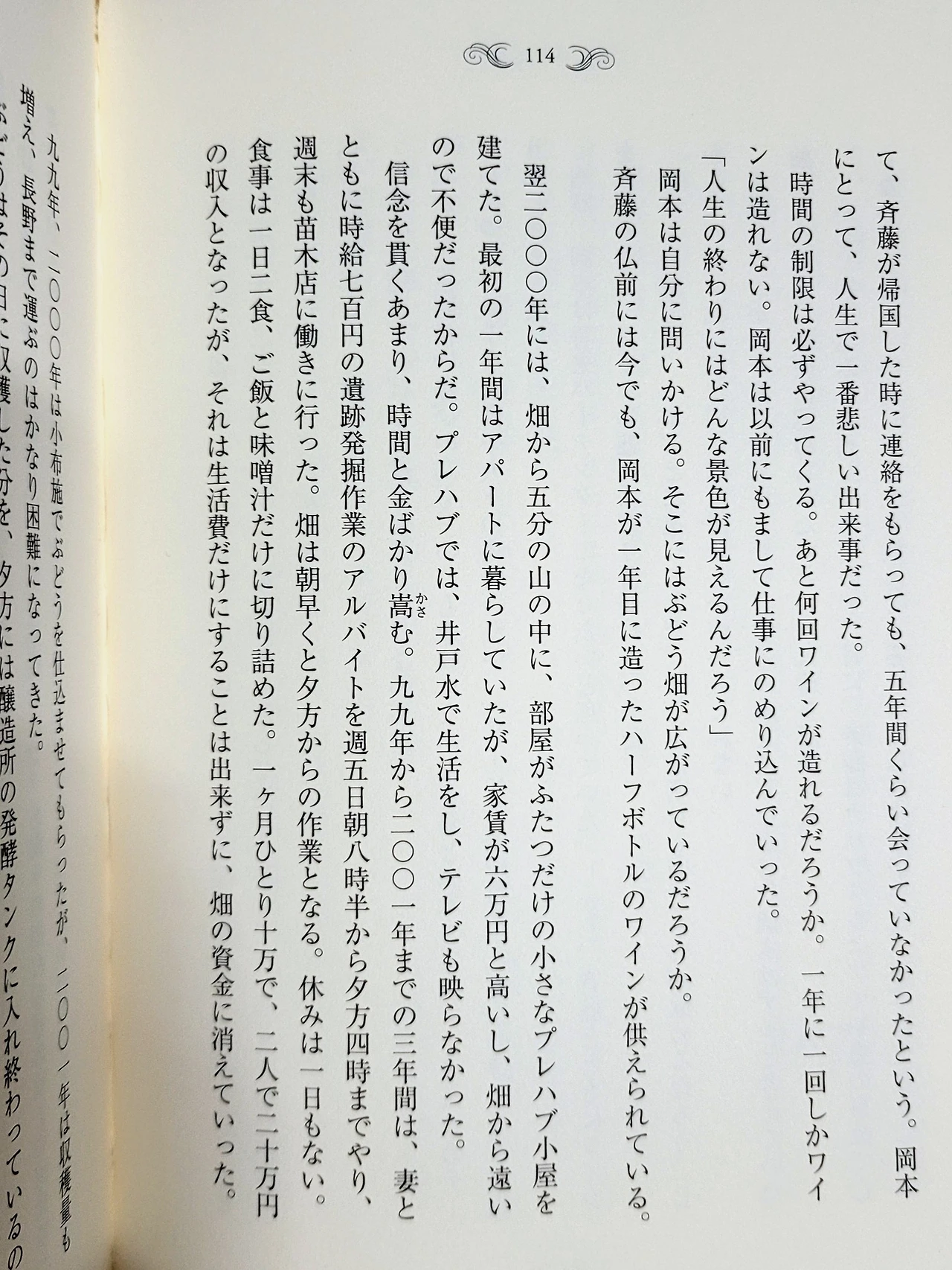 포도를 심고서도 자라는 몇년은 수입을 기대할 수 없었으니 혈연지연도 없는 야마나시에서 아내와 2001년까지 3년간 문화유적발굴 시급 아르바이트로 근근히 식비만 충당했고 99,2000년은 오부세에 포도를 갖고가 양조를 하게 도움받았는데 2001년은 수확량이 늘어 나가노까지 운반하기 곤란해졌다. 생활고등으로 지친 아내도 이혼을 하고 떠나갔다.