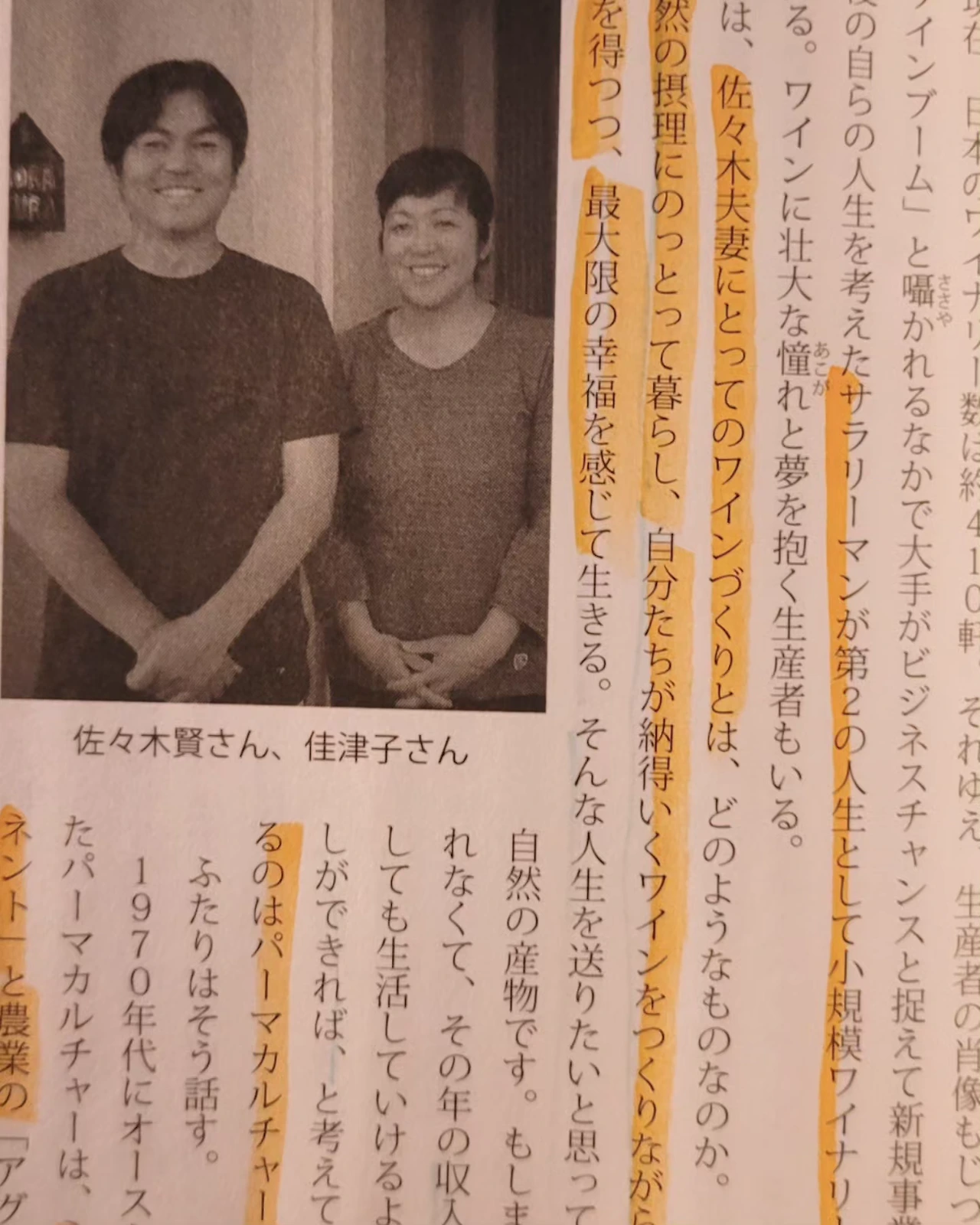 사사키 켄상은 홋카이도 출생, 대학수험생일때 도서관에서 와인에 관한 책을 읽고 흥미를 가져 대학의 길을 가지않고 프랑스에 갈 결심을 한다. 프랑스에 가기 전 도쿄의 소믈리에스쿨에 다니고 오후엔 스쿨사무국에서 일했다. 이때 (현재 야마나시의 도멘 오야마다를 하고있는) 오야마다 코우키상과 만나게된다. 프랑스에 건너간건 2001년. 부르고뉴 본의 양조학교 CFPPA등 에서 2년간 배우고 한번 귀국(식사가 안맞아서.. 그는 절실한 밥파였다고) 그래서 야마나시의 와이너리 루미에르에서 포도재배 담당을 하던 오야마다 코우키상의 밑에서 3년간 일한다. 그러면서 내츄럴 와인을 만나게 됬는데 초산의 냄새나 환원취가 많다고 들었지만 생각보다 맛있다고 느낀다. 그때의 일본에는 오야마다상과 보 페이사쥬의 오카모토에이시상, 카나이양조장의 카나이이치로상, 타케다와이너리의 키시다이라 노리코상, 시온양조에 있는 코바야시츠요시상등이 자연효모에 의한 아황산을 쓰지않는 양조법을 하자는 의식이 있었고 이런게 일본에서 가능하구나 싶었다고. 2006년 비오디나미나 방 나튜르 Vin Nature 를 알고자 다시 프랑스행. 알자스의 크리스챤 비네르나 샹파뉴의 레클라 파르 등에서 연수를 쌓아 비오로직한 양조를 배운다. 한편, 카즈코상은 사이타마현 출생, 집에 음식과 술이 익숙한 풍경이었고 겸업농가였기에 쌀이나 야채등을 재배했었다. 발효학에 흥미를 갖고 도쿄농업대 양조학과에 진학한다. 졸업후 효고현의 神戸고베와이너리의 양조담당으로 일한다. 니혼슈나 지역맥주는 당시 여성양조가의 취업할 자리가 없어 와인의 세계에 들어왔다. 프랑스에 간 것은 당시 와인만들기의 의문에 답을 해줄 사람이 주위에 아무도 없었기 때문, 어학을 공부하고 보르도에서 3개월 부르고뉴에서 9개월은 지낸다. 그리고 최종적으로는 부르고뉴대학의 국가인정양조 DNP코스에 진학을 선택, 이유는 보르도적인 테크니컬한 양조나 와인 만들기는 좋아하는편이 아니라서였다. 프랑스의 대학은 공부하기 아주 빠듯하고 힘들었다고. 카즈코상은 졸업전 와이너리 연수 희망에 도멘 르플레이브를 지원햇으나 학교에서 배우는 정반대적인 곳이라 졸업못한다고 한소리를 듣기도.