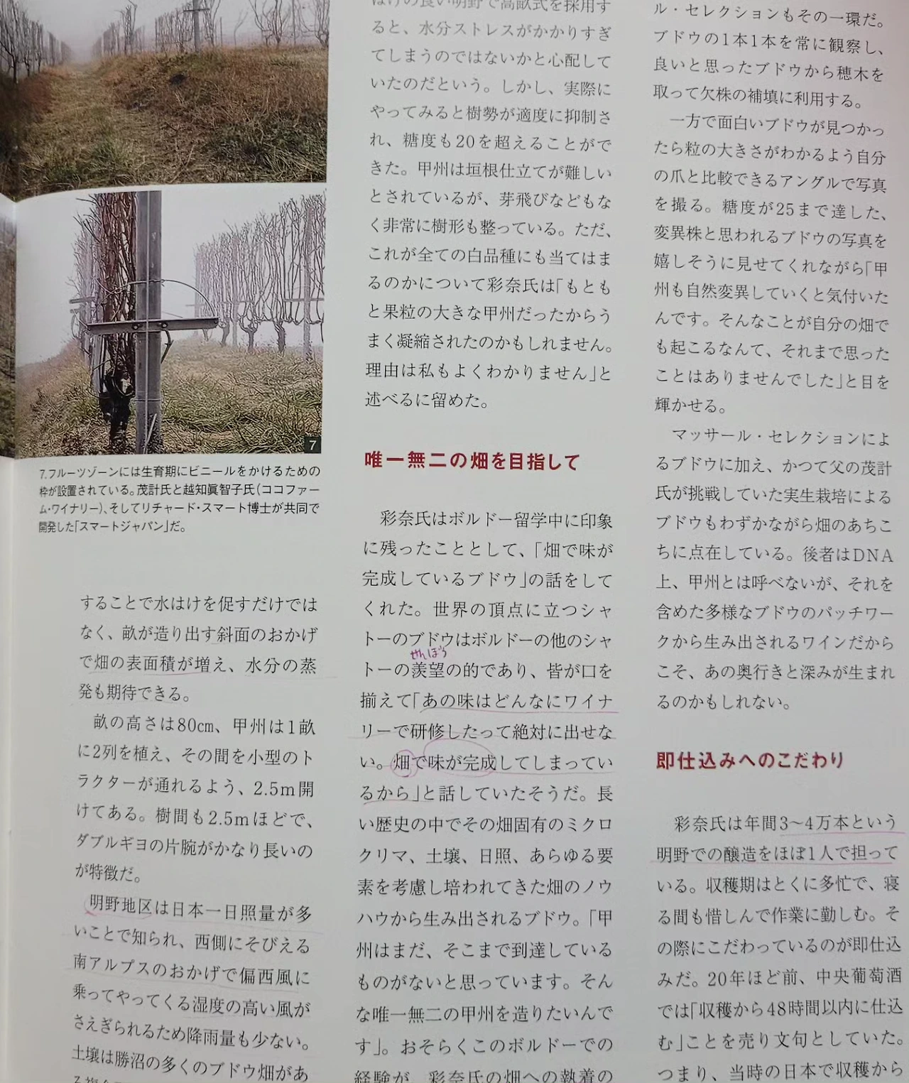 보르도 유학중 인상에 남은 이야기는 '이 맛은 어떤 와이너리에 가서도 절대 낼수 없어. 밭에서 맛이 완성 되어버리기때문에..' 그것에서 비롯된 유일무이한 코슈를 만들어내고싶은 아야나씨의 밭에 대한 집착이었다.