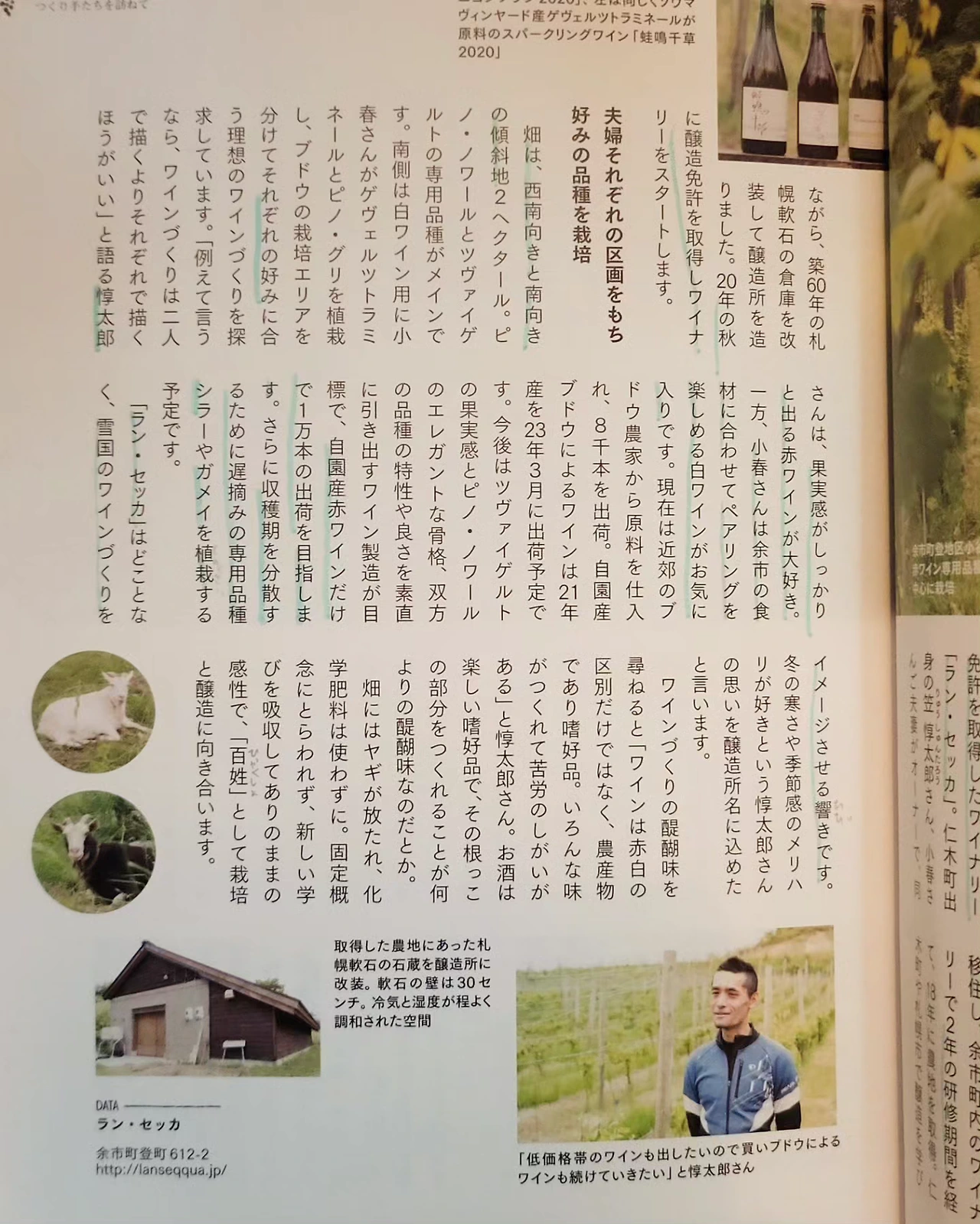 해가 늦게져서 당도를 얻기좋은 서향 경사면, 산을 깎아 개척한 밭, 원래 과수원이었던 비옥한 밭 2가지 지역으로 나눴다. 서남향과 남향의 경사지 2헥타르는 피노누아, 쯔바이겔트, 가메이. 남쪽에는 코하루상이 게부르츠트라미너, 피노그리 본인들 기호대로 기르고있다.