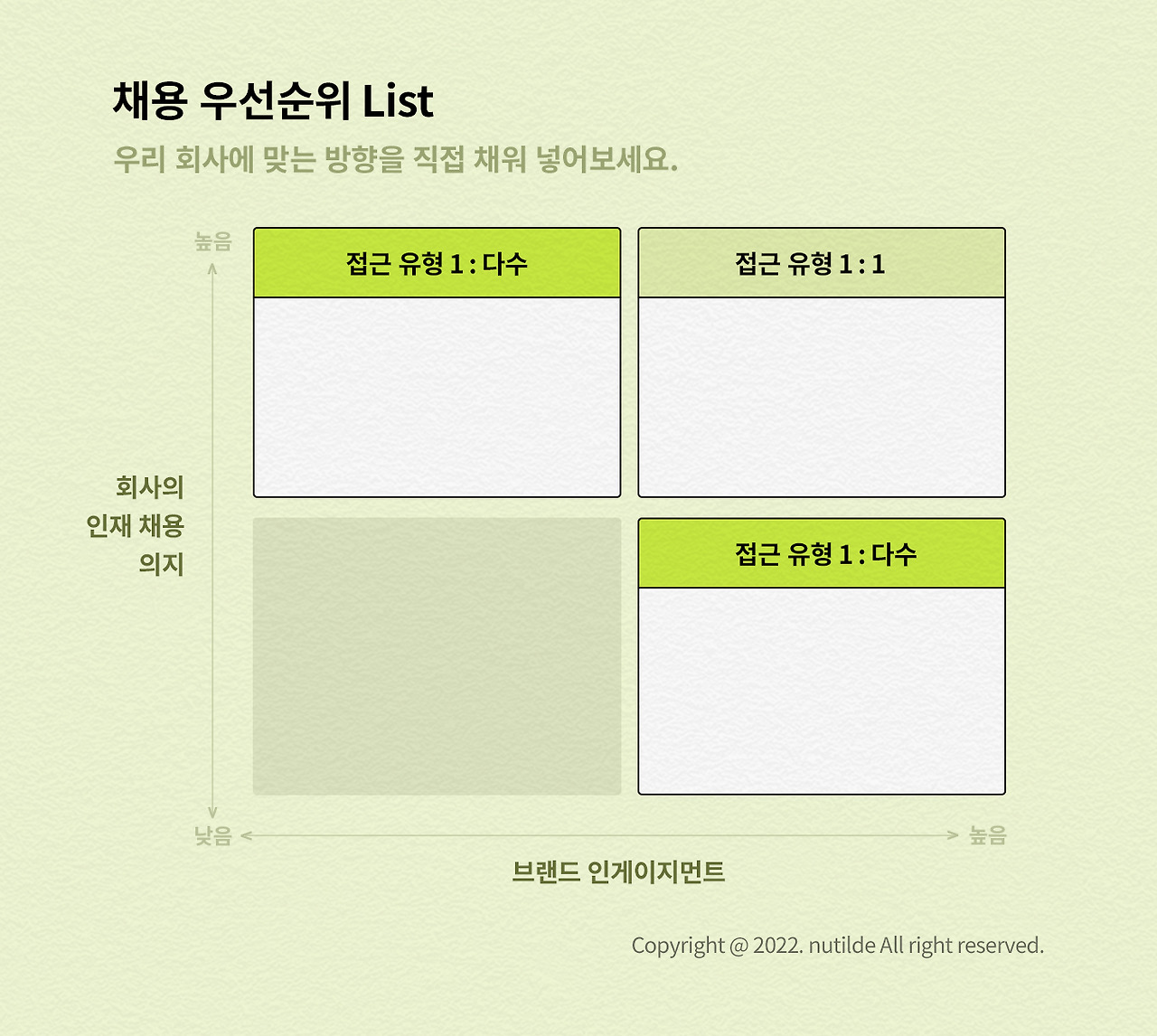 채용을 앞두고 있다면 아래 2X2 사분면을 그려보며 인재에게 다가갈 전략을 세워보세요.