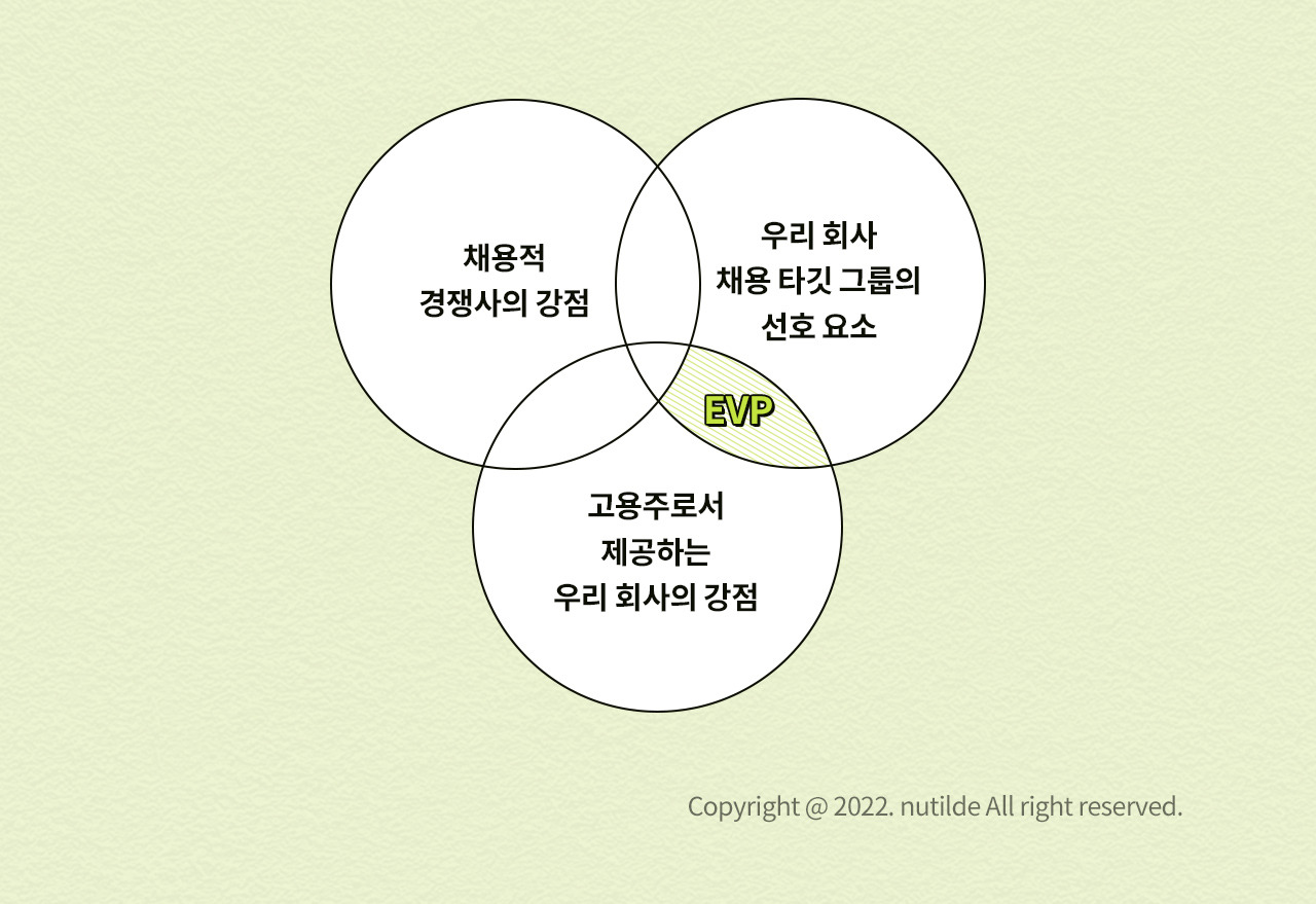 채용 브랜딩에서는 이를 구성원가치제안(Employee Vaue Proposition, EVP)이라고 합니다. EVP를 바탕으로 메시지를 만드는 거에요.