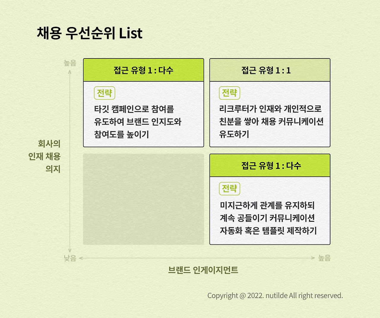 왼쪽 상단의 (가)영역은 회사의 인재 채용 의지가 높지만 채용 브랜드 인지도는 낮은 잠재적인 인재 세그먼트입니다. 여기서 A 씨는 타깃되는 인재에게 회사의 채용 브랜드를 어필하면서, 나중에라도 지원을 하도록 워밍업을 시키는 방향으로 전략을 짜야 합니다. 목표는 (가)의 타깃에게 브랜드 관여도를 높여 (나)의 영역으로 끌어오는 일이에요.