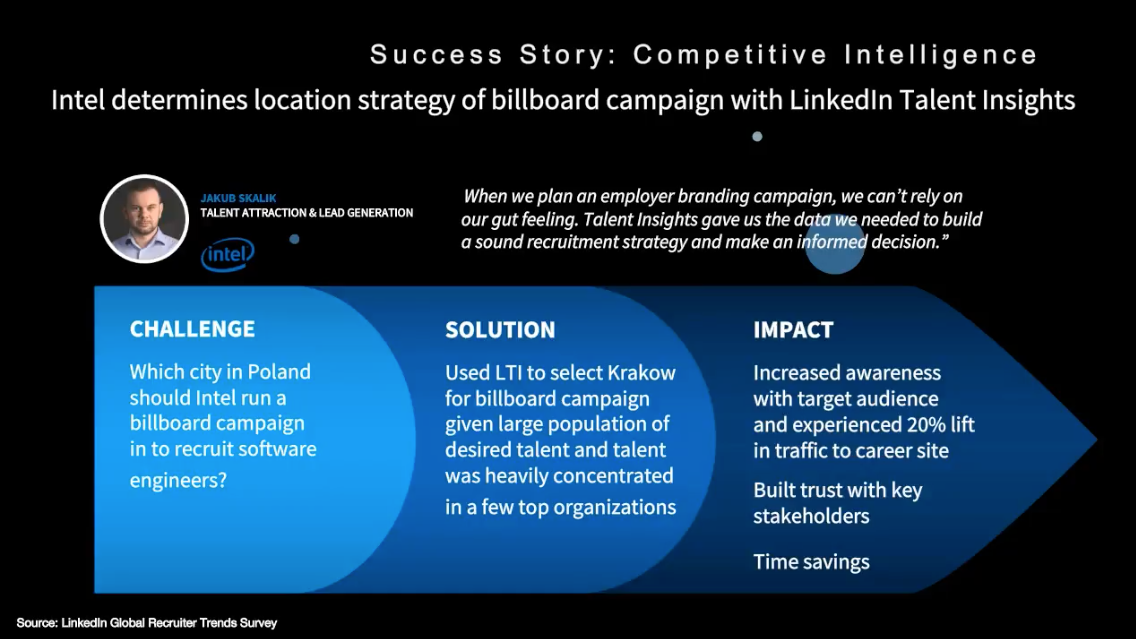 실제로 인텔이 폴란드에 사무실을 열면서 앞서 언급한 4가지 단계를 밟아 명확한 채용 브랜딩 전략을 수립했습니다. 이를 통해 핵심 인재를 명확히 했고 나아가 경쟁사가 어떻게 활동하는지도 데이터로 파악했습니다.
