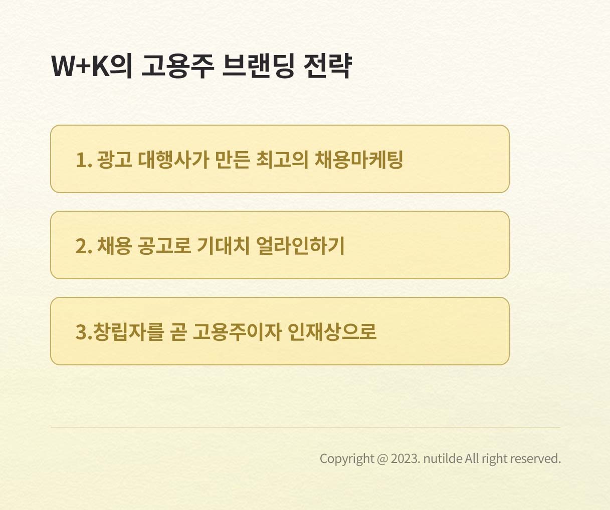 사실 W+K처럼 굳이 이름이 브랜드가 아니더라도, 조직의 리더는 늘 고용주 브랜드의 핵심 페르소나가 아닌가 싶어요. 조직 문화, 업의 본질 모두에 리더십의 철학이 담기기 마련이니까요. 그렇게 생각하면 리더의 퍼스널 브랜딩만큼 파워풀한 고용주 브랜딩 전략도 없는 것 같아요. 이런 리더와 함께 일하고 싶다는 것도 인재들이 우리 조직을 선택하는 강력한 이유가 될 수 있으니까요.