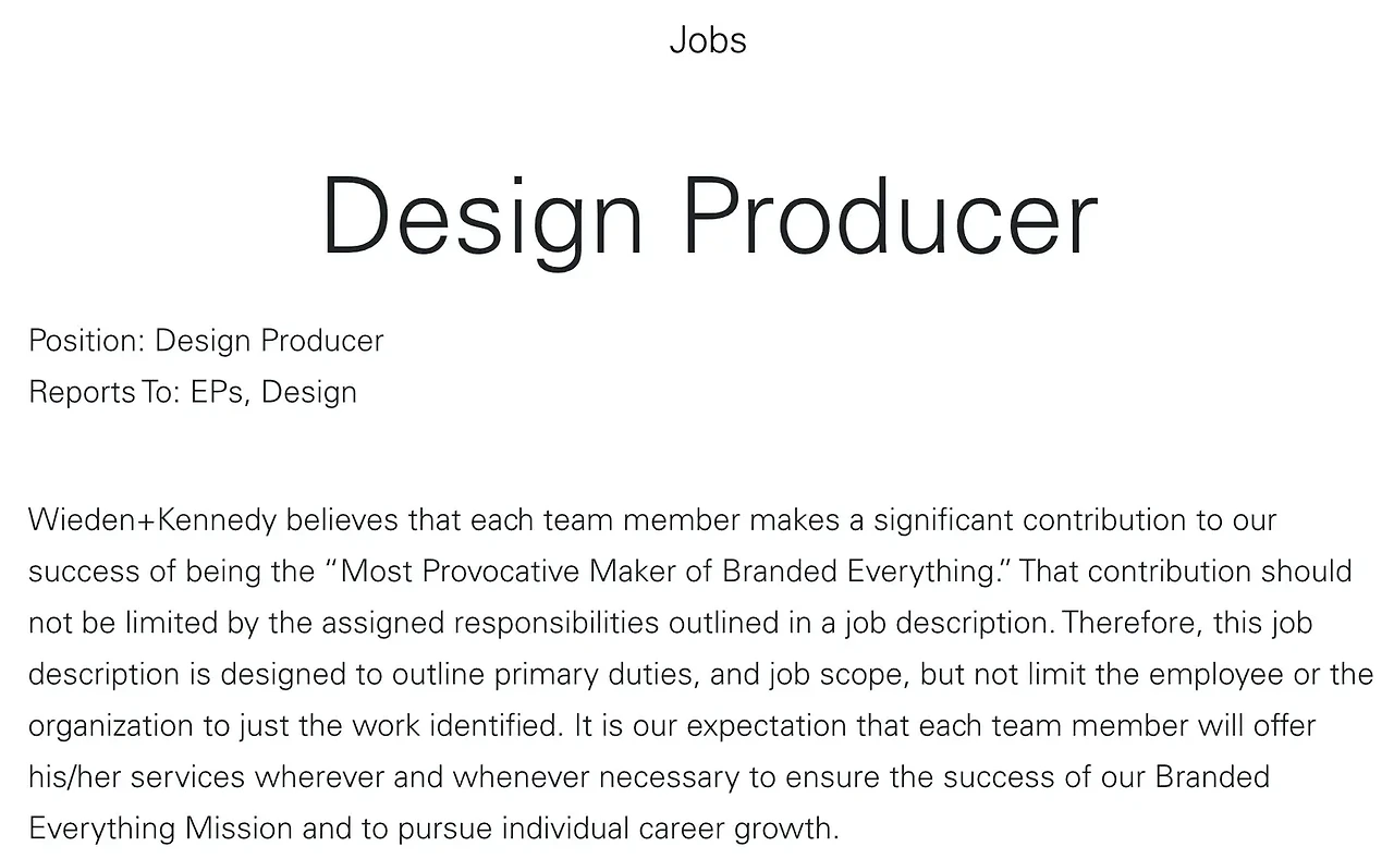 특히 인상적이었던 건, 아래 명시된 JD가 일의 전부가 아닐 것이라고 말하는 부분이에요. W+K가 "가장 도발적인 브랜드 제작자(Most Provocative Maker of Branded Everything)"가 되기 위해서, 그리고 본인의 커리어 성장을 위해서 무엇이든지 할 수 있으니 일에 한계를 두지 말라는 거죠.