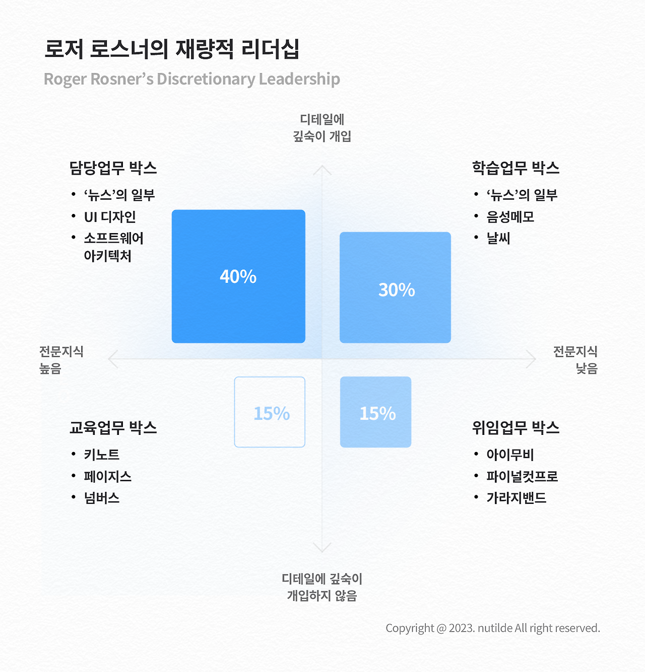 다시 말해 로스너는 이미 소유한 핵심 전문 지식을 활용해 일할 수 있는 분야 40%, 새로이 학습해야 하는 분야 30%, 다른 사람들을 교육해야 하는 분야 15%, 위임해야 하는 분야 15%로 시간을 나누어서 앱 및 활동 범위와 우선순위를 정했어요. 로스너만의 재량과 역량으로 리더십 틀을 짠 것이에요.