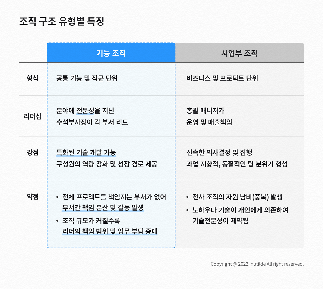 따라서 기능 조직은 규모가 커질수록 부서끼리의 갈등과 사일로(silo)가 발생할 가능성이 높고, 부서의 이익에만 몰두해서 조직 전체의 목표를 놓치기 쉬워요. 무엇보다 빠르게 의사결정하기 어렵다는 구조적 특성 때문에 경쟁이 비교적 적은 시장의 중소기업에게 가장 적합한 구조로 알려져 있답니다.