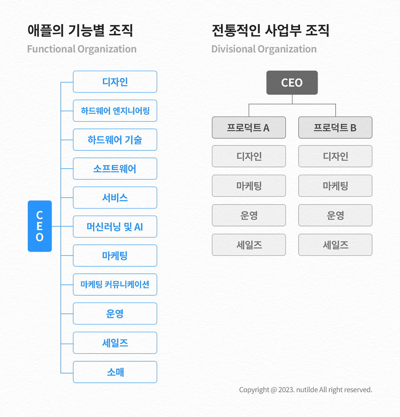 그래서 애플이 기능 조직을 구축하고 유지하기로 한 것도 쉽지 않은 결정이었어요. 2022년 기준 16만 명이라는 대규모 인원이 근무하고 있고, 그 어느 곳보다 경쟁이 치열하고 변화가 잦은 테크 시장의 플레이어인데 기능 조직 형태를 선택한 것이기 때문에요.