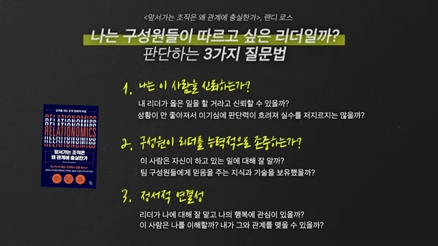 글로벌 기업들의 조직문화를 자문하고 컨설팅하는 랜디 로스(Randy Ross)는 책 ‘앞서가는 조직은 왜 관계에 충실한가’에서 이 3가지 질문의 답을 통해 구성원이 따르고 싶은 리더인지 아닌지 확인해볼 수 있다고 해요.