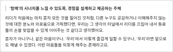 결국 리더와 팀원이 서로 이해하고 어려움을 함께 해결해 나가는 과정에서 조직이 더욱 단단해질 수 있는 것이 아닐까요?