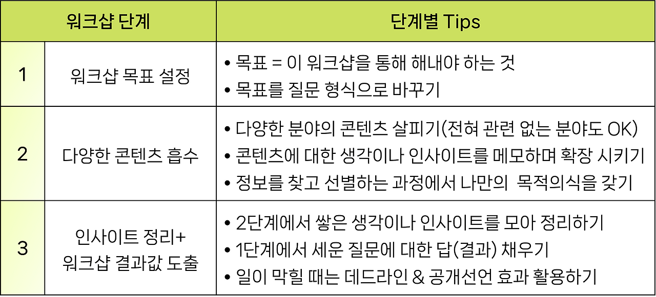 특히 이 과정에서 결과값을 ‘질문’으로 만들어 보기를 추천하는데요. 목표를 질문 형식으로 바꿔 답을 내리다 보면 자연스럽게 워크샵의 결과가 나올 수 있다는 것이죠.