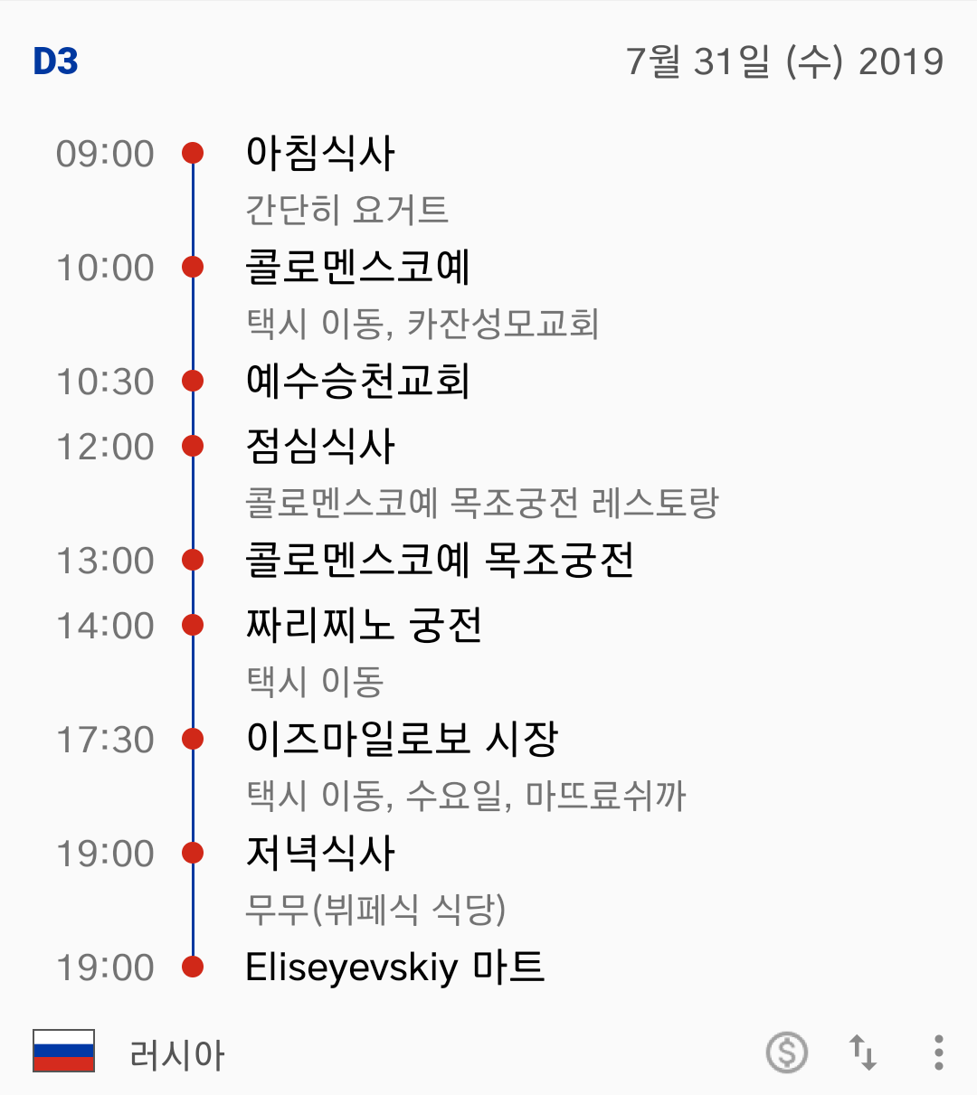 3일 차 경비 약 5,000 루블 : 콜로멘스코예 제반 (800루블) + 짜리찌노 (400루블) + 식사 (2,000루블) + 택시 및 기타 (1,500루블)