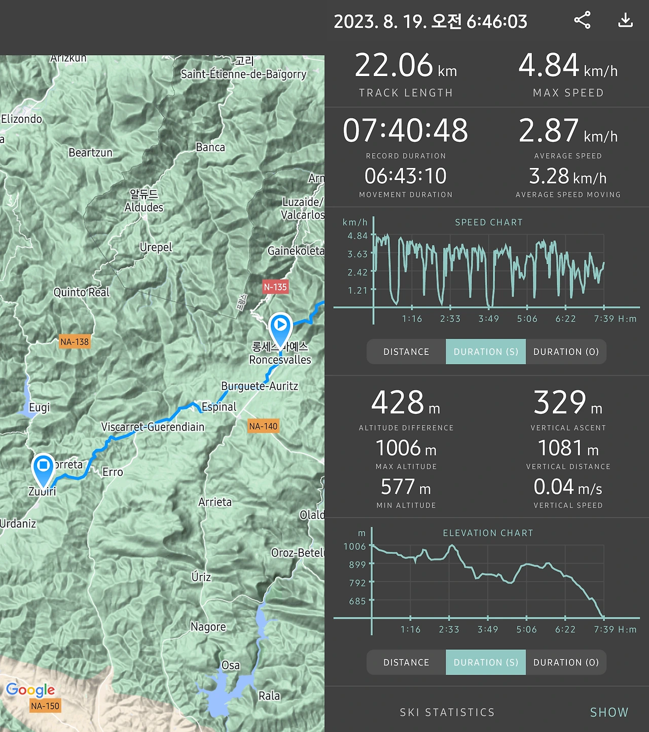 시작. 롱세스바예스(Roncesvalles) 종료. 수비리(Zubiri) 해냄. 7시간 반 / 22.06km