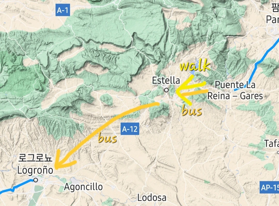 엄지발가락과 검지발가락 사이의 양쪽 발바닥에 잡힌 넓은 물집이 쉬이 가라앉지 않았다. 전날 동키를 사용해서 여력이 있는 아부지는 하루치 길을 다 걷기로 하고, 나는 버스를 타고 홀라당 이동하기로 했다. 그대로 에스테야(Estella)에서 만난 뒤, 로그로뇨까지 버스로 바로 뛰어넘는 것이 이날의 동선.