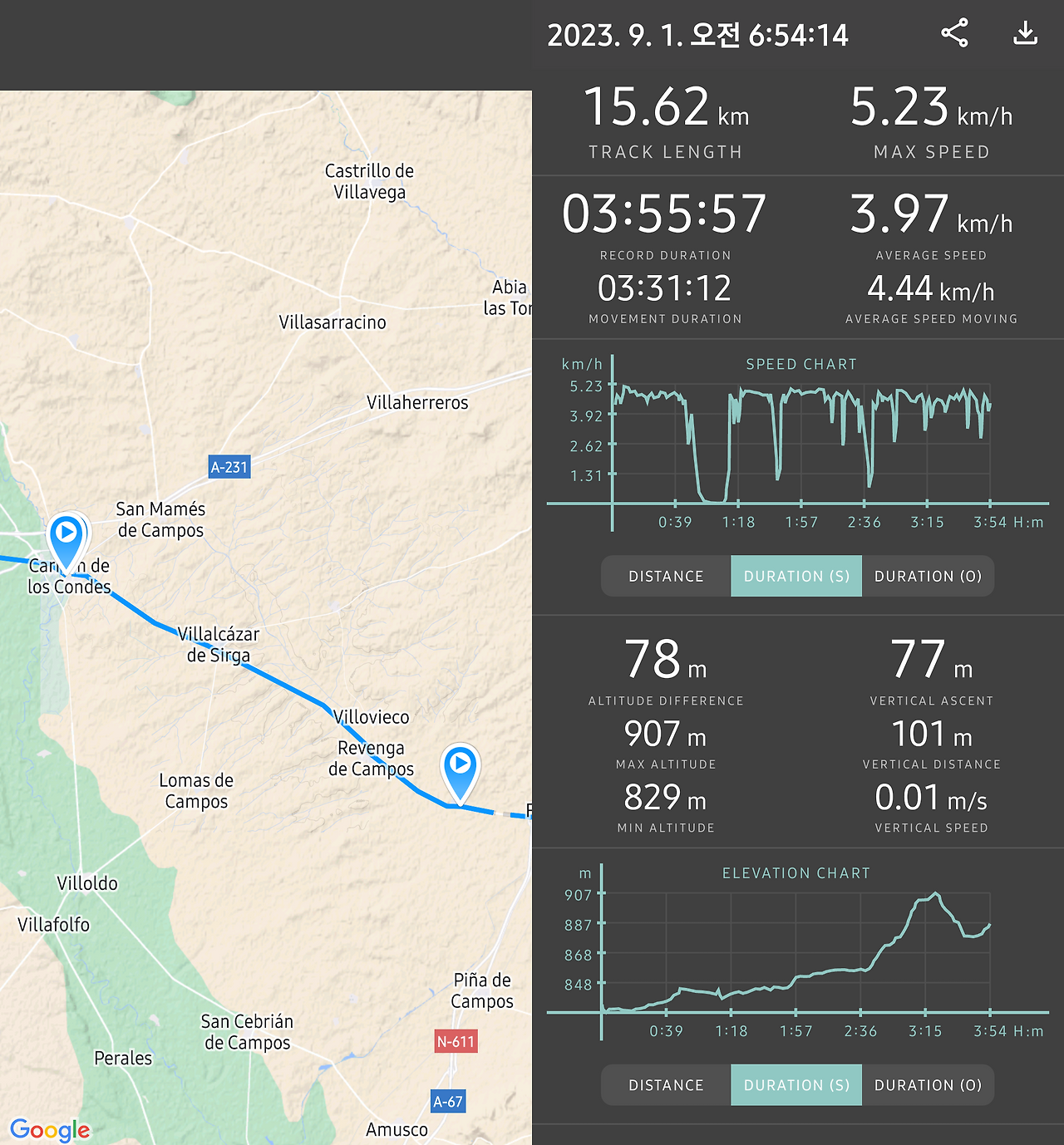 시작. 포블라시온 데 캄포스(Poblacion de Campos) 종료. 카리온 데 로스 콘데스(Carrion de los Condes) 해냄. 4시간 / 15.62km