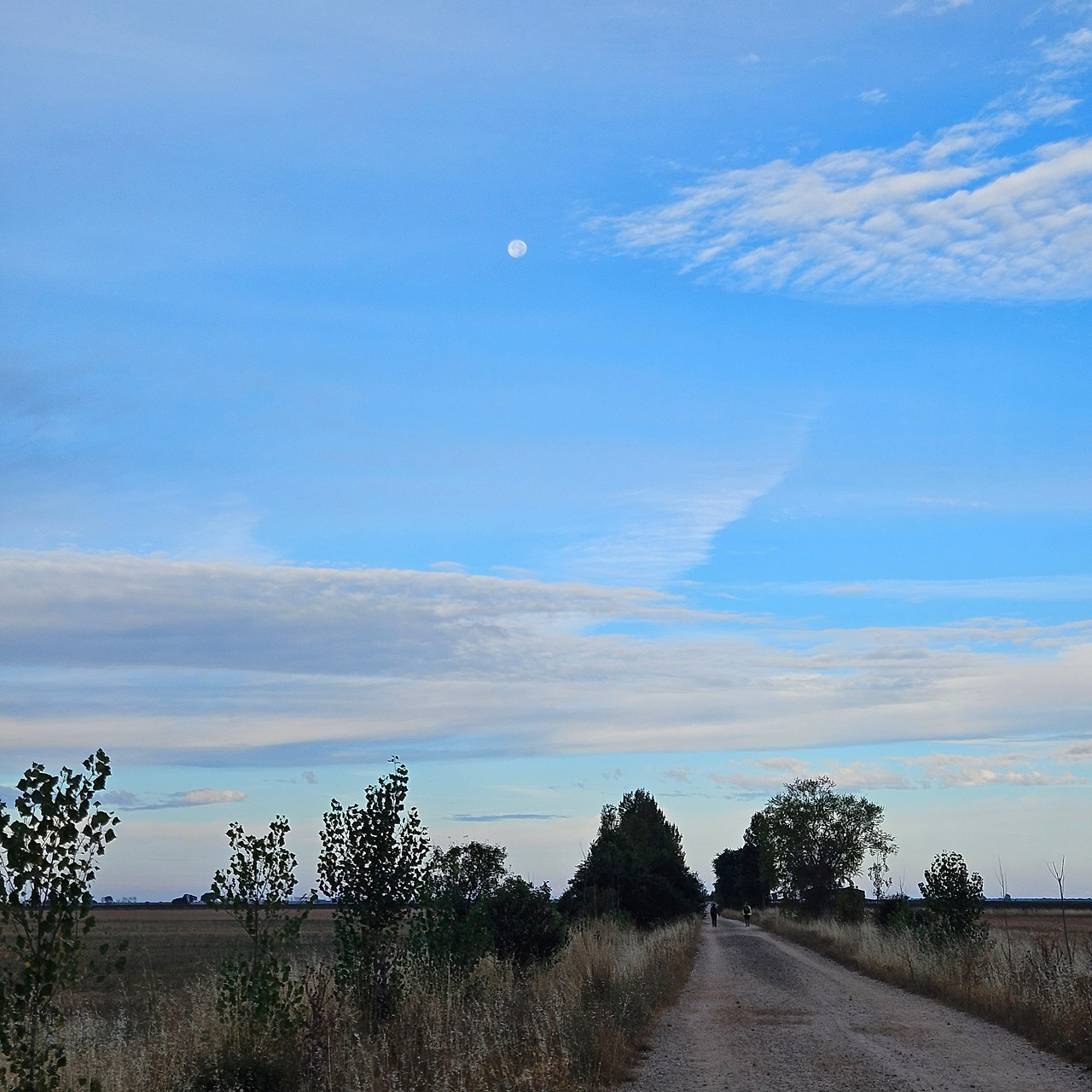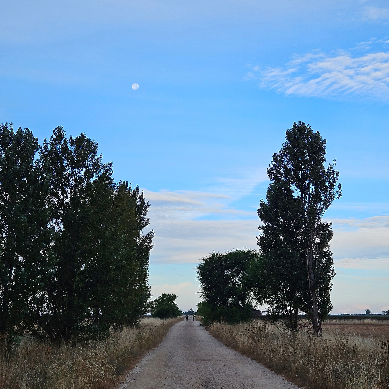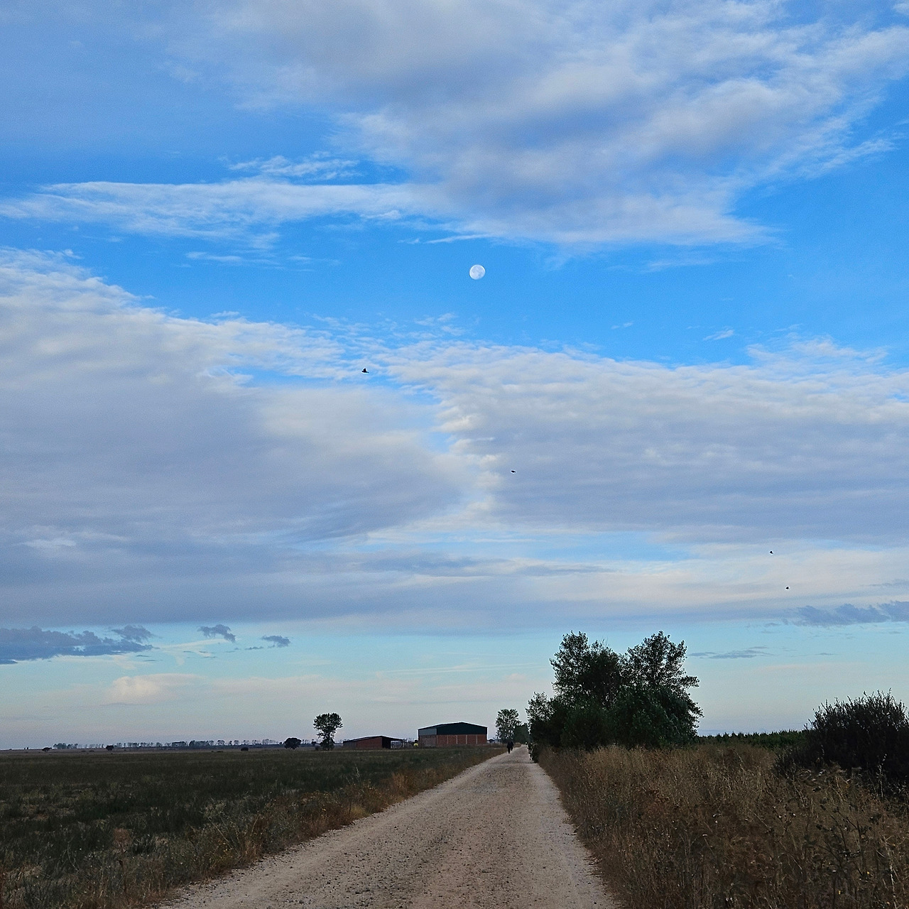 파란 하늘을 배경 삼아 덩그러니 떠있는 새하얀 달. 해가 떴음에도 선연하게 존재감을 뽐내는 창백한 빛깔이 지나치게 아름다워서 현실감이 없다. 굴곡 없이 잔잔하게 이어지는 땅, 바람 따라 끊임없이 흐르고 변화하는 하늘. 그 둘이 맞닿은 저 멀리의 지평선은 그저 아득하다. 이 침착한 고요야말로 까미노의 정체성 그 자체가 아닐까.