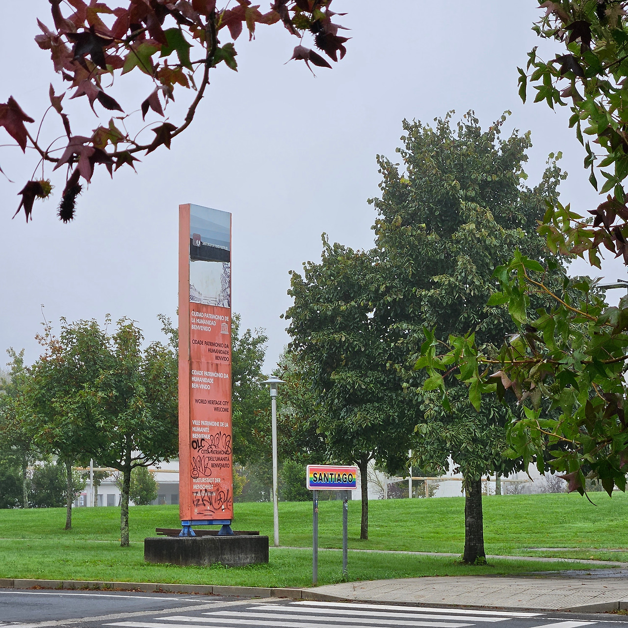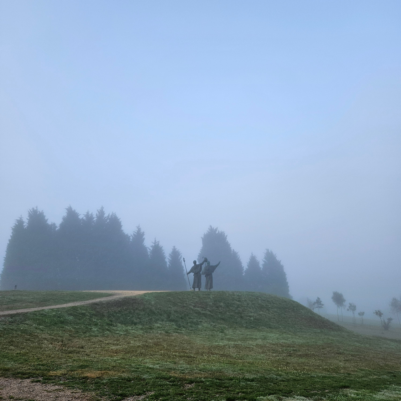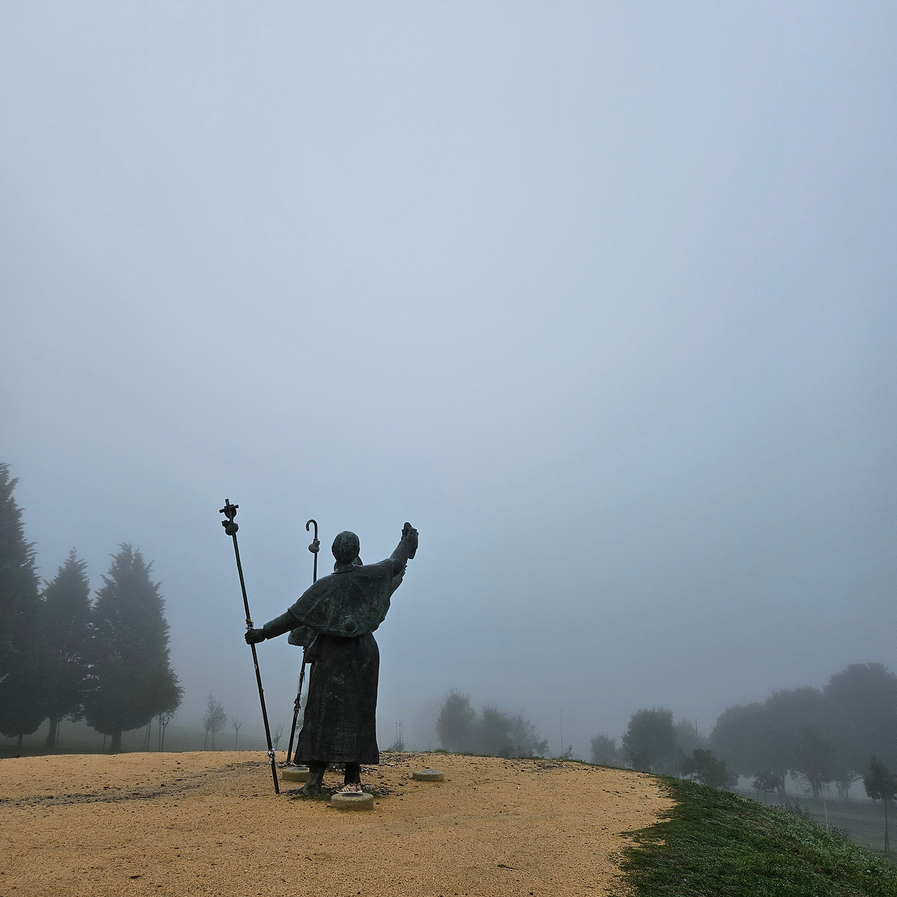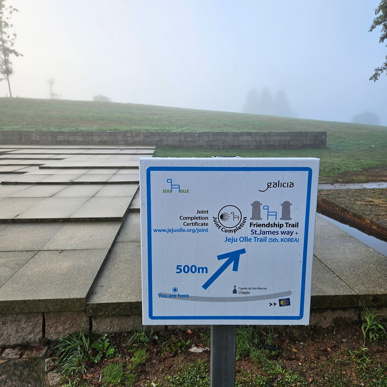 공원이 워낙 넓은 데다가 안개도 짙어서 헤매고 있는데, 산책 중이던 현지인이 손으로 저쪽을 가리키며 맞게 찾아왔다는 제스처를 한다. 감사 인사를 하고 조금 더 걸어보니, 이내 언덕 위의 순례자상(Monumento ao camiñante)이 흐릿하게 보인다. 여기서 산티아고가 보인다던데, 한 치 앞도 흐리멍덩한 오늘은 그저 뿌옇다. 그래도 산티아고가 시야에 잡힐 만큼 가까워졌다는 것이 실감 나기 시작한다.