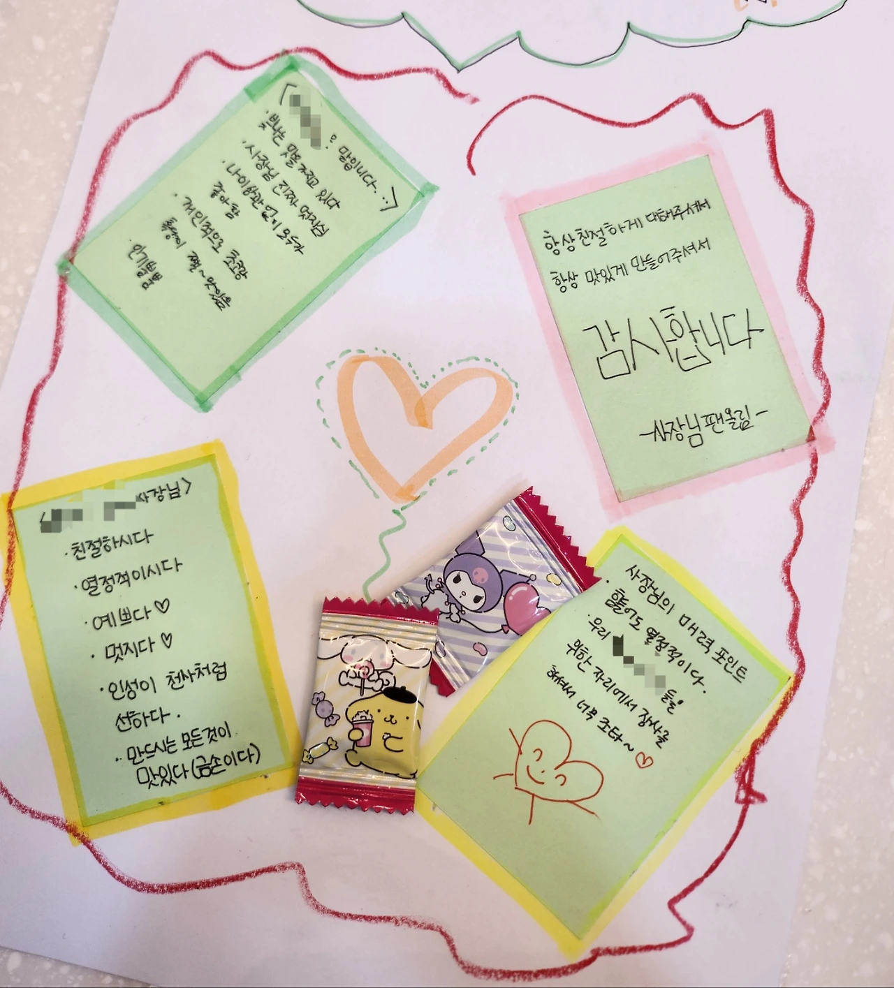 "저희 선생님이 사장님 너무 좋아하셔서 칠판 판서에 사장님을 쓰셨어요."