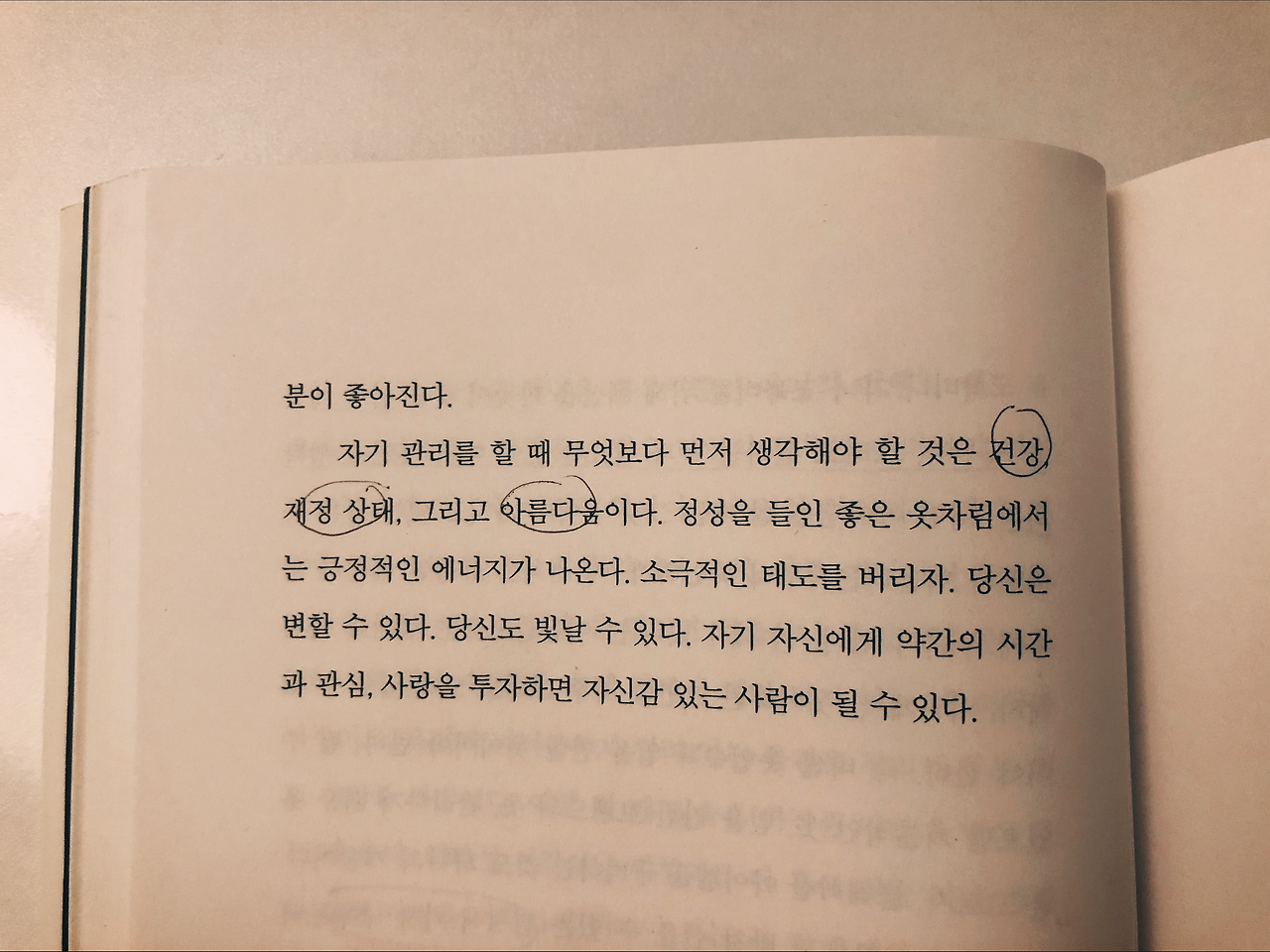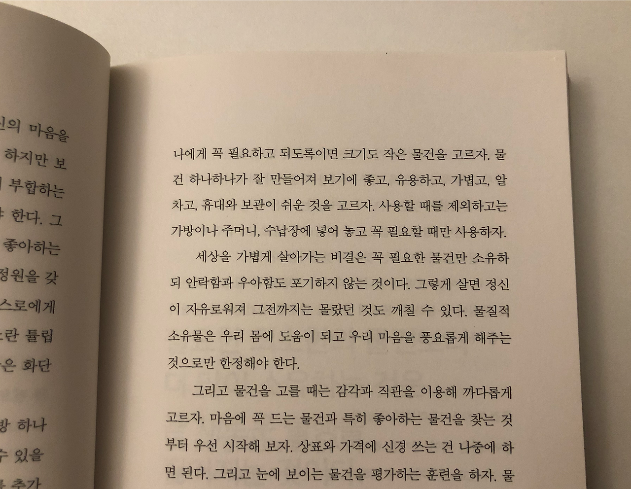 내 모토이고 가장 사랑하는 문구인 검이불루(儉而不陋) 화이불치(華而不侈). 김부식이 삼국사기에 기록해 백제 정신과 문화를 대변하는 말로 “검소하지만 누추하지 않고, 화려하지만 사치스럽지 않다”를 뜻한다. 이 책도 검이블루 화이불치에 매우 동일한 내용들이 들어있어 많이 느끼게 해 주고 배우게 해 준 책이다. 물건, 몸, 마음으로 챕터를 나눠서 설명하는데 ‘나’의 육체적, 정신적 건강과 삶에 있어 ‘기본’이 무엇이 되어야 하는지 다시 생각하게 해 준다.