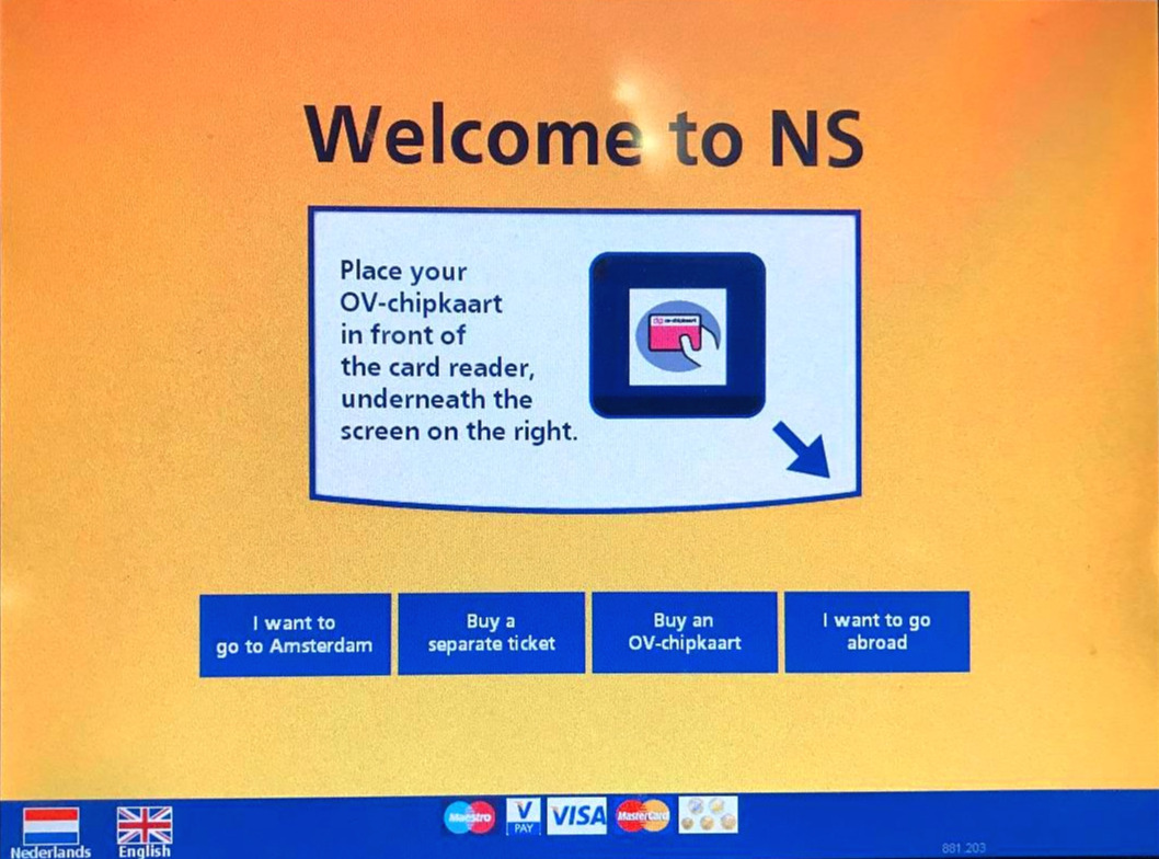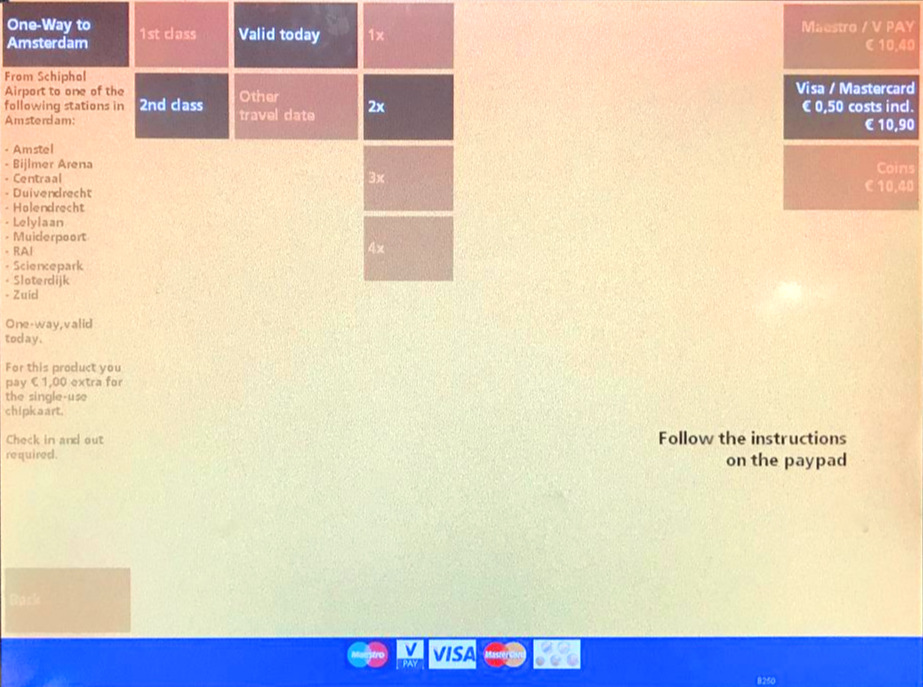결국 'I want to go to Amsterdam' 버튼을 5번은 선택하고 나서야 결제할 수 있었다. 3번째부턴 암스테르담에 가고 싶은 간절한 마음으로 버튼을 선택했다. 일정 시간 동안 카드를 삽입하지 않아 모든 과정이 초기화되었기 때문이다. 처음 보는 카드 리더기에 카드를 투입할 줄 몰라서 우물쭈물했다. 결국 다른 사람이 결제하는 모습을 곁에 보고 나서야 결제할 수 있었다. 카드를 사각기둥 리더기에 밀착시키고, 기계 방향으로 밀어 넣는 방법이었다. 이걸 몰랐다니.