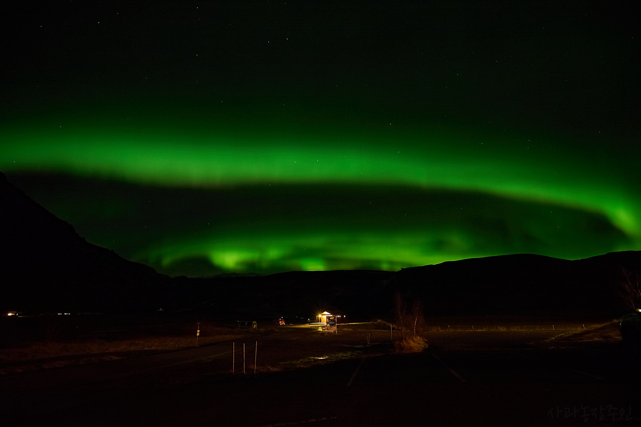 건너 산에 부딪친 소리는 여러 갈래 튀어 되돌아왔다. 조용했던 시골 스코가(Skógar)가 시끄러워졌다. 호텔 투숙객들이 하나둘 나오며 질러댄 환호성 덕분이다. 우리 모두 오로라를 꿈꾸던 사람들인가 보다.