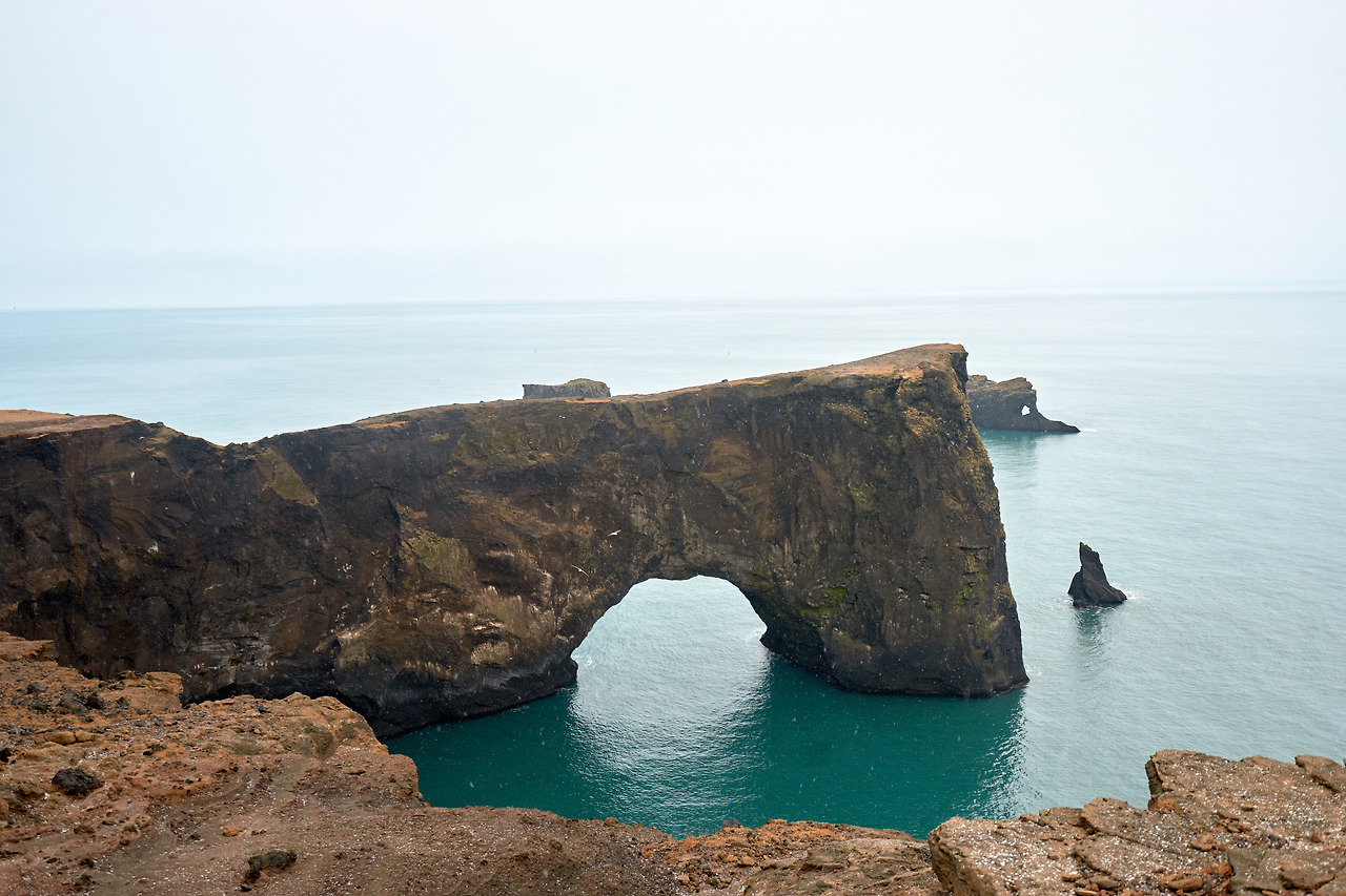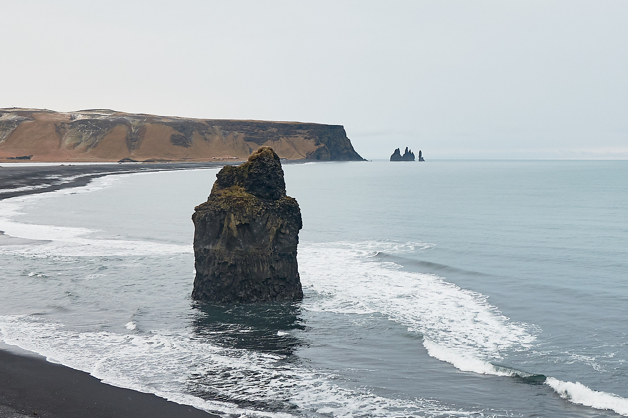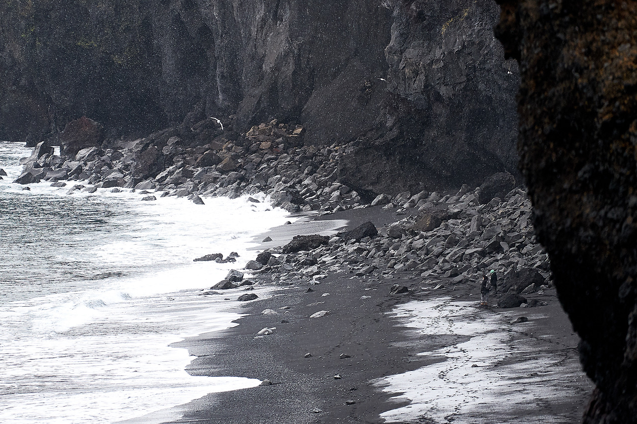 상부만 보고 간다면 섭섭하다. 디르홀레이 하부도 상부 못지않게 아름답다. 검은 해변 레이니스피아라(Reynisfjara)는 검은 먹 듬뿍 묻힌 붓을 들고 멀리 주상절리 산 레이니스펠(Reynisfell)로부터 이 곳 디르홀레이까지 쓱 그은 듯하다. 부드러운 검은 해안선이 밀려오는 잔잔한 바다를 받아들일 때면, 맘이 차분해짐을 느낀다. 햇빛에 반사되어 눈을 자극하는 황백색 모래와는 또 다른 느낌이다.