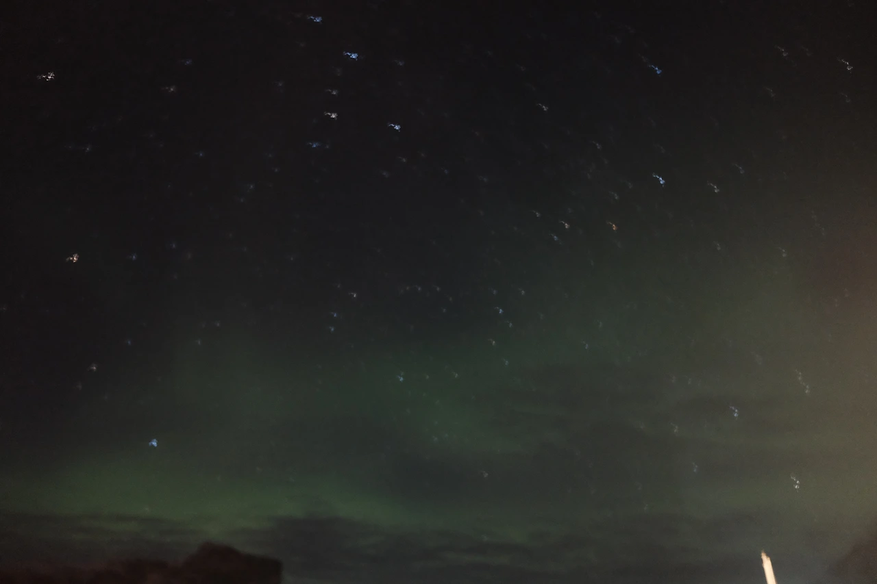 예보와 달리 허연 오로라는 보이지 않았다. 나풀거리는 하늘 커튼이 없음을 확인하고선 아내 목에 걸린 자그마한 카메라를 들어 하늘을 찍었다. 삼각대 없인 흔들린 사진이 찍힐 뿐이지만, 오로라 추적 장비에 이만한 게 없다. '고스트 버스터즈'에 나온 유령탐지기처럼 말이다.