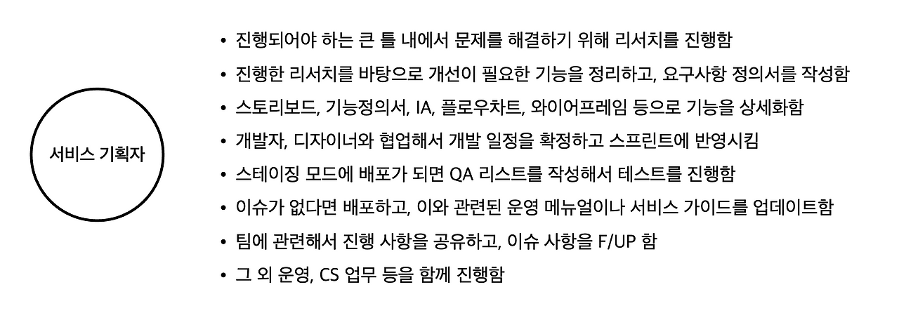 그 외에는 PM과 비슷하다고 생각한다. 즉, 서비스 기획자는 서비스의 설계와 관련해서 더 디테일을 챙기는 역할을 한다고 말할 수 있다.