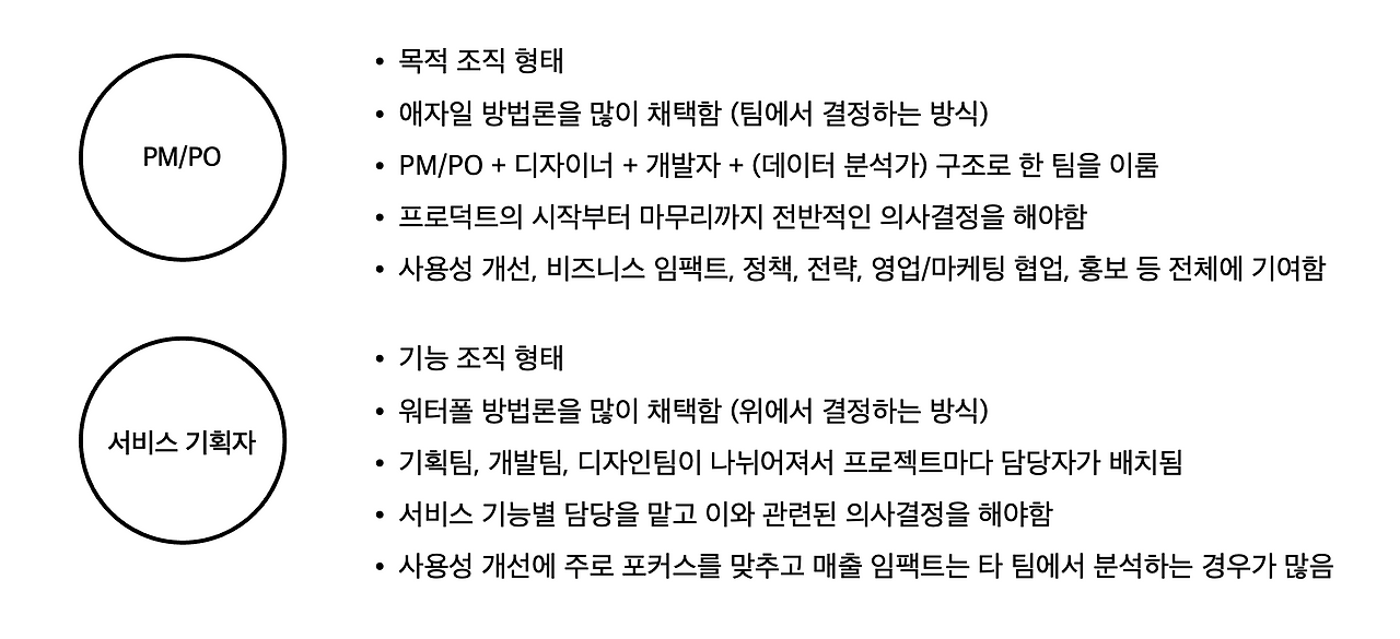 Product Manager, 즉 PM과 서비스 기획자가 있는 조직의 모습을 살펴보면 모든 케이스가 그렇다는 것은 아니지만 PM은 주로 목적 조직, 서비스 기획자는 기능 조직에 존재한다. 여기서 추가로 설명하자면, PM과 PO는 차이가 없다고 생각한다. 두 직무가 함께 있는 몇 안 되는 기업을 제외하고는 각각 요구하는 역량은 같다. 국내에서 PO 하위 조직에 PM이 있다고 생각하는 인식과 다르게 실리콘 밸리에서는 PM 하위 조직에 PO가 있기도 하다. 그렇기에, 이 글에서는 두 직무를 통칭해서 PM이라고 부르려고 한다.