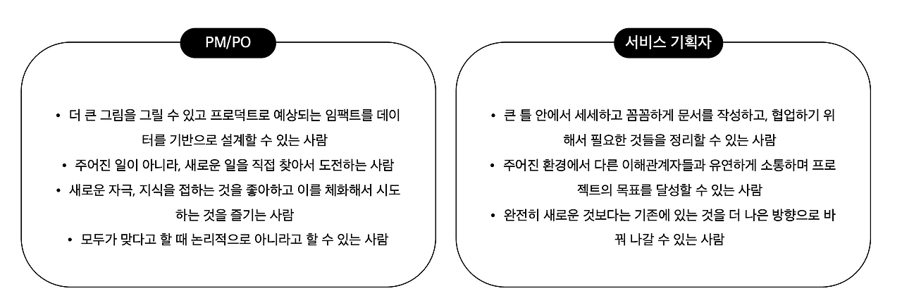 이러한 역할을 수행하고 있기 때문에 외국에서 서비스 기획자와 가장 유사한 직무는 Product Manager라고 정의할 수 있고, 그렇기에 비교적 최근부터 많은 IT 기업이 해당 직무로 채용을 하기 시작했다. 나 또한 첫 커리어는 "서비스 기획자"라는 이름으로 시작되었다. 그렇기에 회사에서 두 직무에게 어떤 역할을 요구하는지 알고 있다.