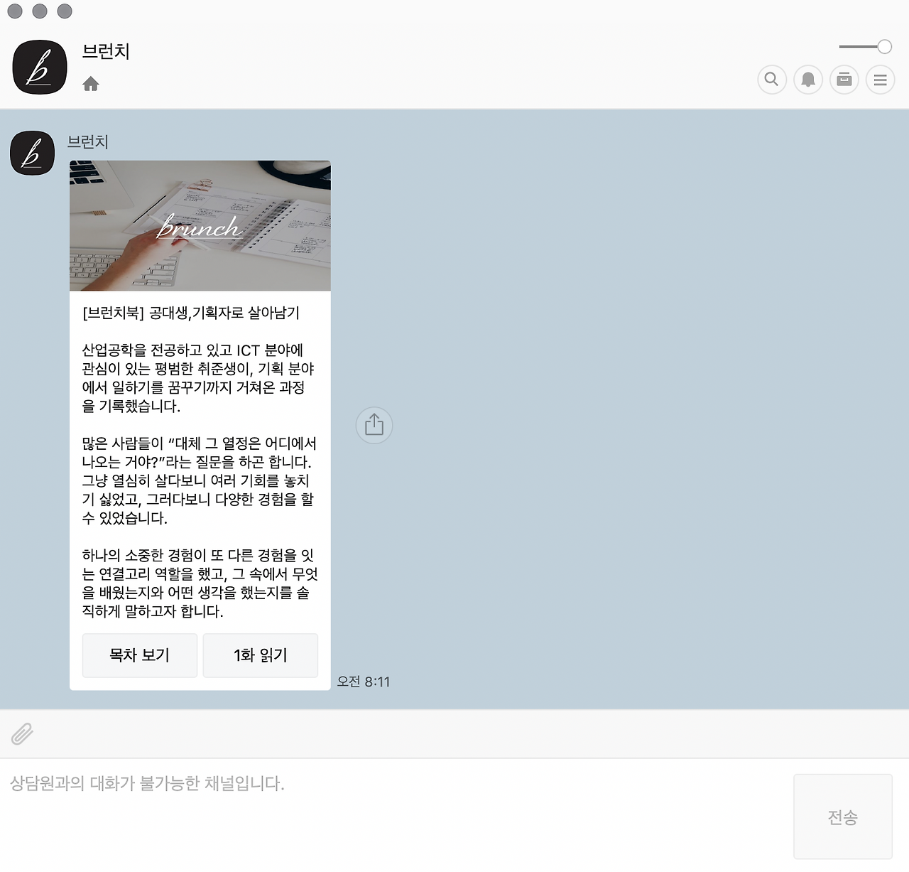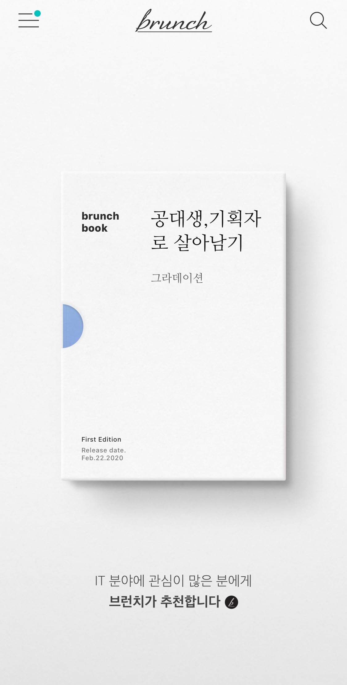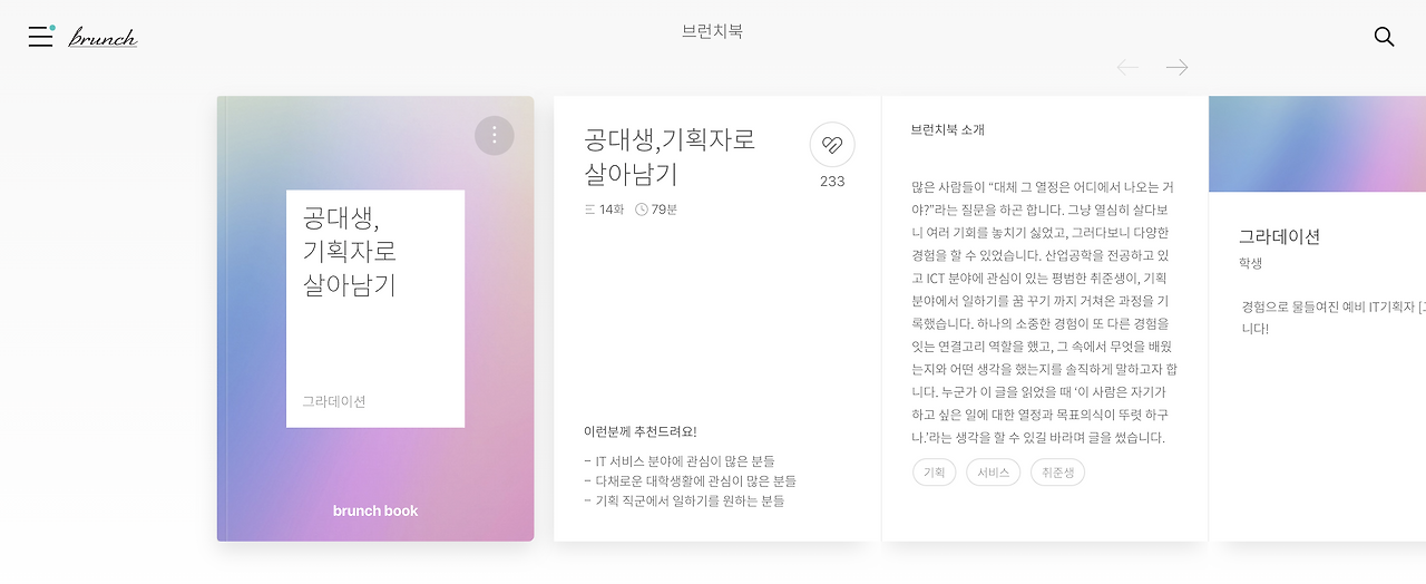 [공대생, 기획자로 살아남기]라는 브런치북을 만들었고, 카카오 플러스 친구에 소개되기도 했으며 얼마 전에는 브런치 홈 화면 첫 페이지에 노출되기도 했다. (홈 화면에 노출된 것은 정말 생각도 못해서, 그 당일에 '오늘따라 왜 이렇게 사람들이 많이 구독을 하지? 싶었다.)