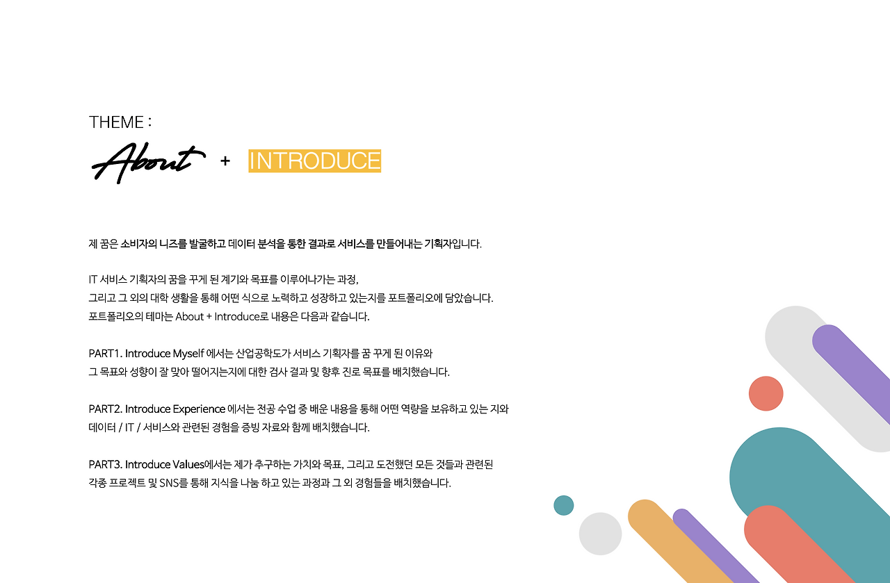 2020년 상반기만 해도 포트폴리오 경진대회에 한 번 더 나가고자 했다. 그러나, 중간에 포트폴리오를 통째로 날려먹고(온갖 방법을 통해 복구해보려고 했으나 전부 실패했다) 다시 시작하자니 도저히 시간이 없음을 깨달았다. 완성을 하지는 못했지만, 나름 했던 활동들을 다 정리했고 안에 들어가는 내용 또한 새롭게 리뉴얼할 수는 있었다. 앞으로 기업에 제출하는 포트폴리오는 위와 같은 프레임에서 수정할 예정이다.