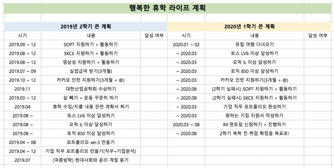 그렇게 휴학을 하게 되면 무엇을 할까 신나게 작성해보았다. 적다 보니 취업 준비에 포커스가 맞춰지기는 했지만, 나름대로 세세하게는 못 만나던 친구도 만나고 오랜 기간 내려가지 못했던 고향에도 가고 여행 계획도 세웠다. 특히 포트폴리오를 다시 만들고자 했는데, 그 이유는 내가 명확히 무엇을 했는지와 무엇을 하고 싶은지를 확실히 알고 싶다는 생각이 컸다.