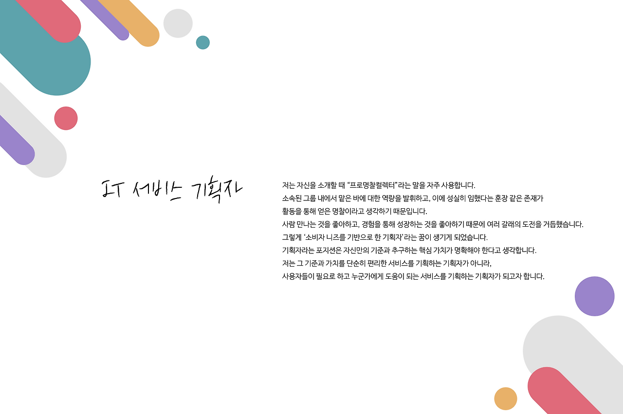 기획자는, 서비스에 대해서 확실히 이해하고 있어야 하고 섬세해야 하며 커뮤니케이션 능력 또한 갖추고 있어야 한다는 것을 SOPT 활동을 통해 배웠다. 사용자를 분석하고, 시장을 조사하고 데이터를 분석해서 결론을 내리는 것과 BM을 찾아내고 수익성을 발굴하는 것 또한 필요한 역량이다.