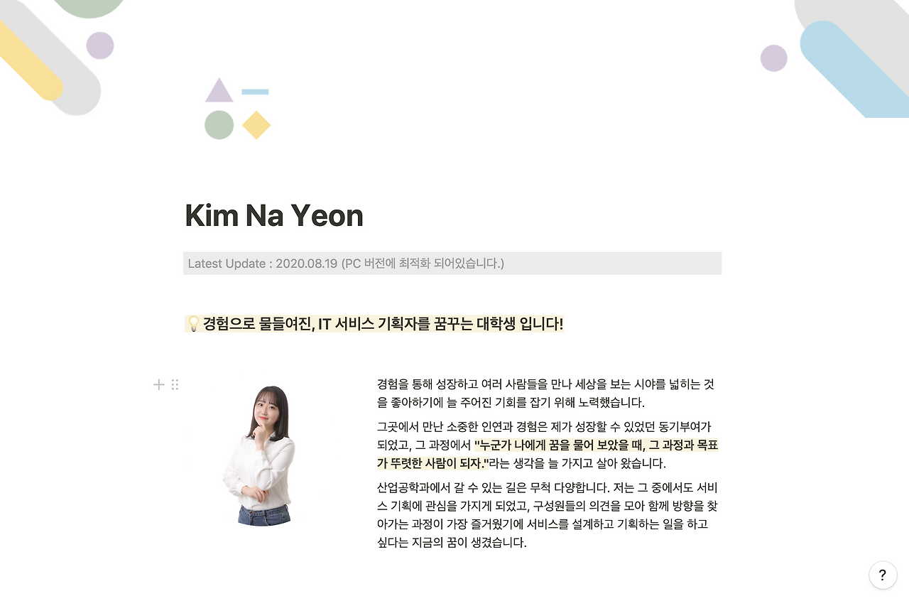 그렇게 wix에 정리했던 경험들을 노션에 옮기고 있다. 아마 개강하기 전까지는 완성할 수 있을 것 같다. 완성하게 된다면 노션을 활용한 포트폴리오 제작이라는 제목으로 글을 하나 써 볼 예정이다.
