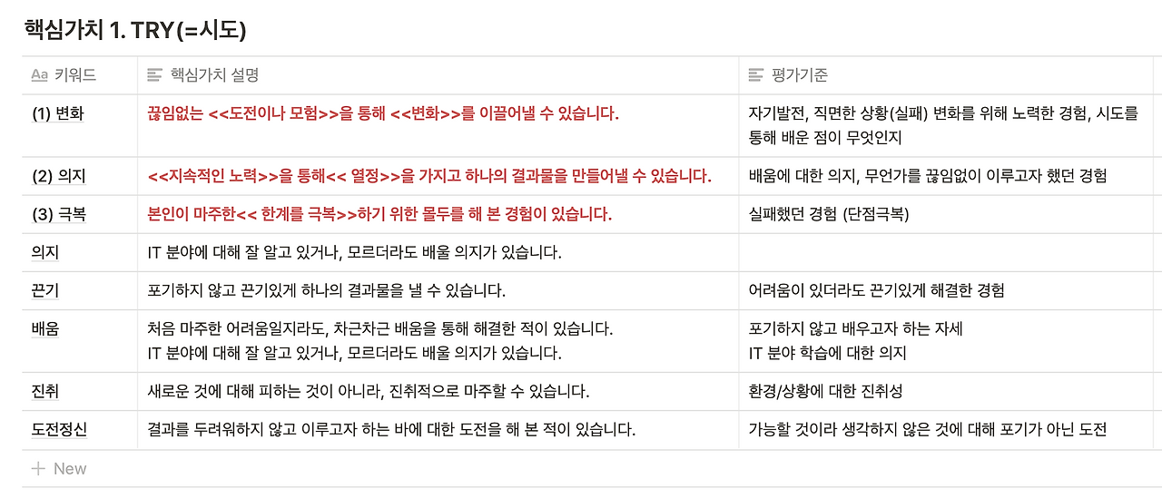 그렇게 정한 "TRY, WITH, IMPACT"라는 가치를 바탕으로 키워드를 뽑아냈다. 예를 들어, TRY(=시도)에는 변화와 의지, 극복, 끈기, 배움, 진취, 도전정신을 포함했다. 각각의 키워드에 TRY의 핵심 가치를 담아냈고, 이를 바탕으로 자기소개서와 면접 때 중요하게 평가할 기준을 세웠다.