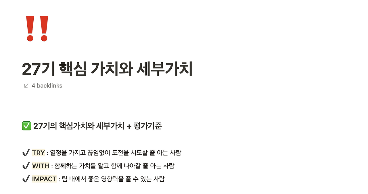 회의를 바탕으로 3가지 핵심 가치를 정했다. 열정을 가지고 끊임없이 도전을 할 줄 아는 사람, 함께하는 가치를 알고 나아갈 줄 아는 사람, 그리고 팀 내에서 좋은 영향력을 줄 수 있는 사람. 이전 기수들과는 다르게 우리는 영어로 핵심 가치를 정했다. (직관적으로 나타내기에는 영어가 더 좋다고 생각했기 때문이다.)