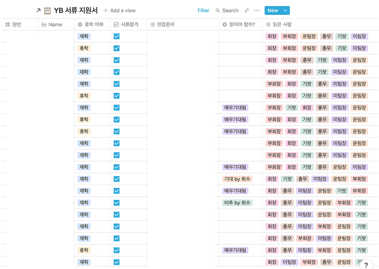 바로 노션으로 모든 작업을 해결하는 것이었다. Admin 페이지로 업로드되는 모든 지원서들을 파트장들이 노션에 업로드하고, 이를 노션의 필터 기능을 활용해서 평가할 수 있도록 한 것이다. 기존의 웹페이지 평가 방식에서 달라진 점은, 읽은 자기소개서를 표시할 수 있고 자기소개서 내에 코멘트를 달 수 있으며 주목해야 하는 포인트를 임원진 모두와 공유할 수 있다는 점이다.