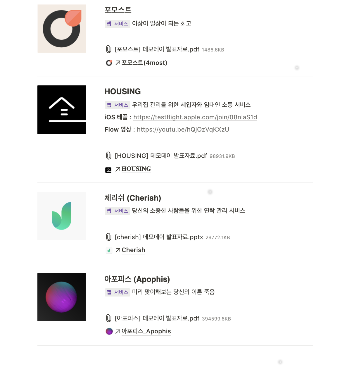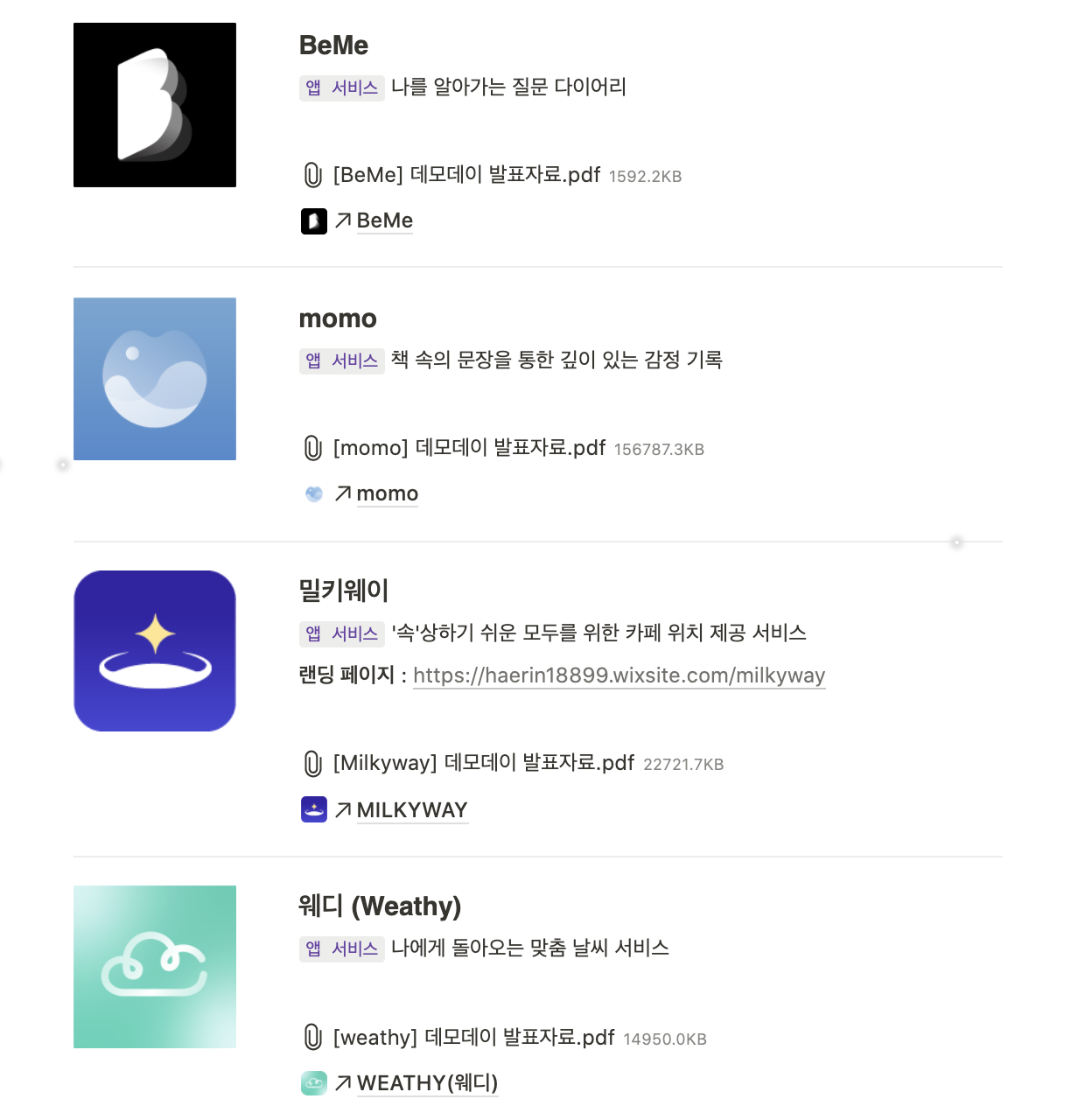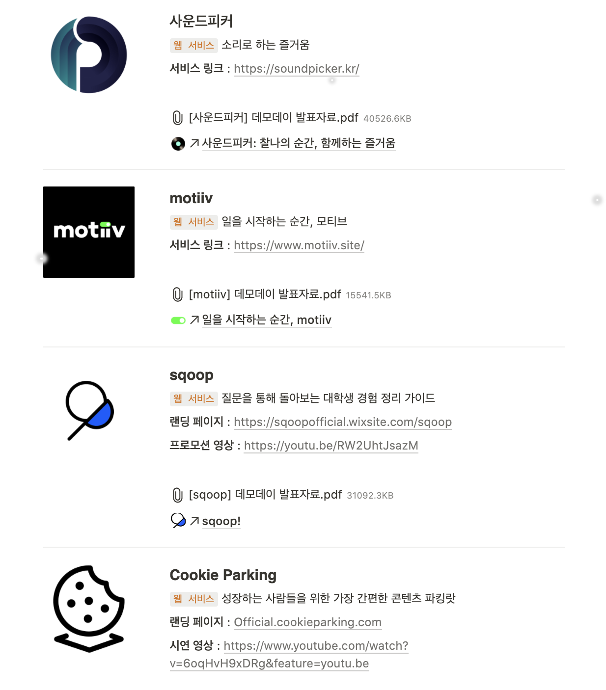 데모데이 소개 페이지에서 확인할 수 있는 서비스 소개와 자료들