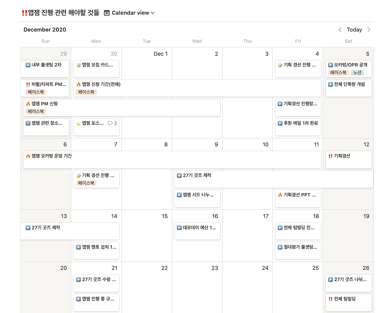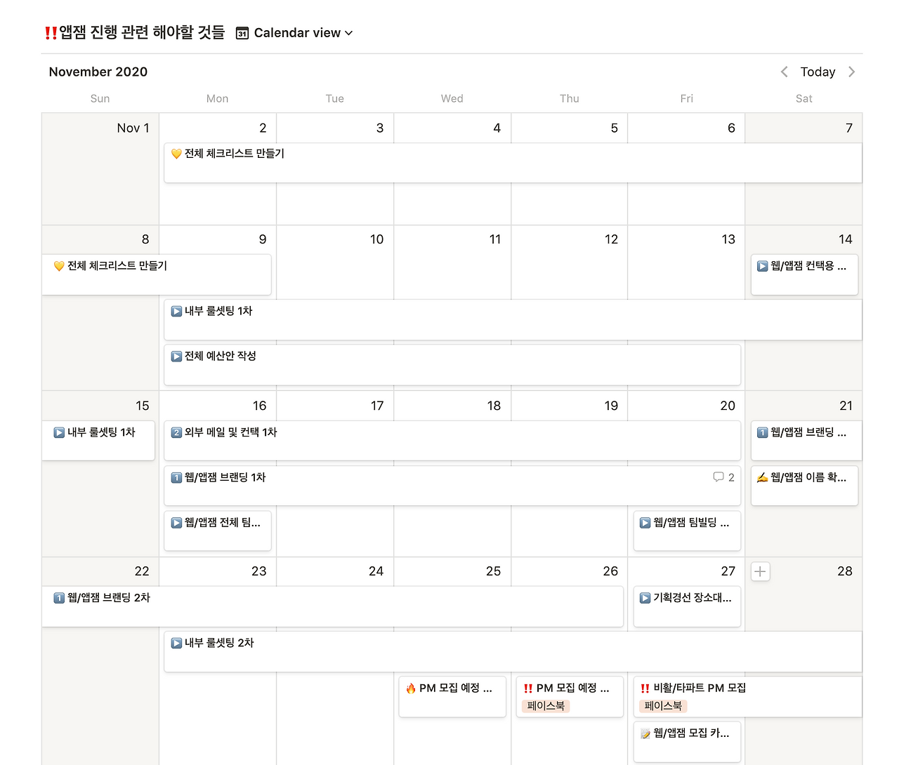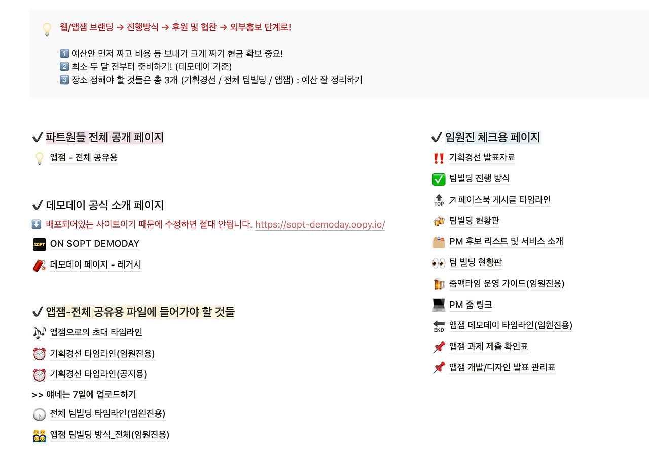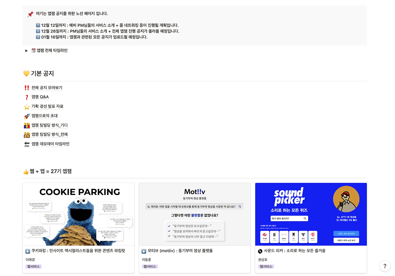 앱잼과 관련된 모든 진행사항과 공지, 그리고 안내 내용을 볼 수 있도록 노션 페이지를 따로 파서 운영했다. 가장 핵심은 온라인 환경에서도 공지사항 전달과 행사 진행과 관련된 타임라인을 명확히 하는 것이었다. 오프라인에서는 변수가 생겨도 대처하기가 그리 어렵지 않다. 하지만, 온라인은 네트워크 환경이나 전달 오류, 소통의 어려움 등으로 발생하는 시간의 낭비가 심할 수밖에 없었다.