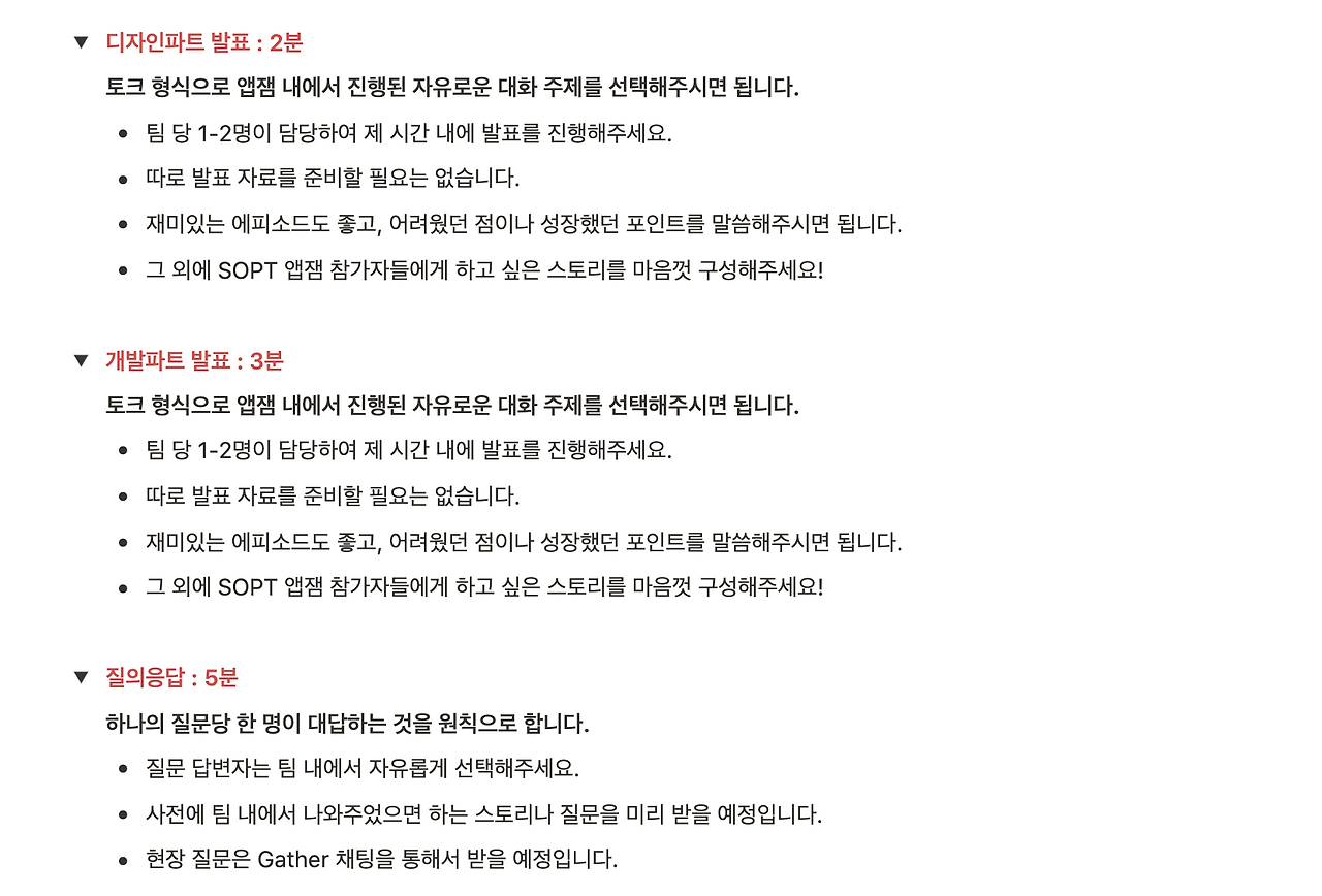 그렇게 팀 당 16분의 발표 시간을 배치했다. 서비스 소개 시간을 4분 정도 발표한 다음 협업 방식 공유 시간 2분, 디자인 파트와 개발 파트 에피소드 발표 5분, 그리고 질의응답 5분을 받는 식으로 구성했다.