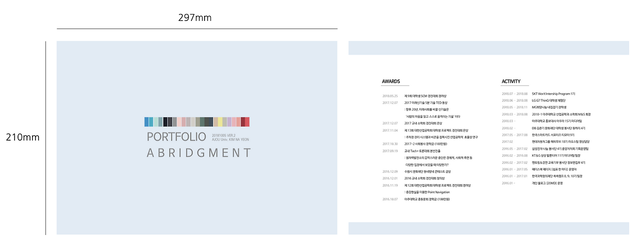 두 가지 모두 A4 사이즈를 기준으로 제작하는 것이 편할 것이다. 혹시 용량에 상관없이 고화질로 뽑아내고자 한다면 A3나 A2를 기준으로 제작하면 깨지지 않는다. (물론, 보통 포트폴리오를 제출하는 경우 용량 제한이 있을 것이기 때문에 굳이 이 방법은 추천하지 않는다)