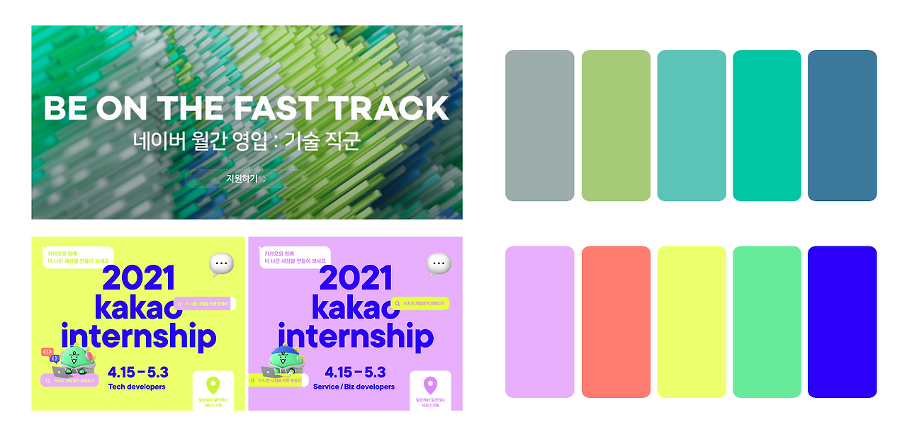 기본적으로는 표지, 자기소개, 경력 정리, 경험 설명 및 증빙자료로 우선 페이지를 크게 나눈다. 그리고 지원하는 직무나 기업에 따라서 안에 들어갈 내용이나 색깔, 그리고 강조할 포인트를 조금씩 바꾼다. 가장 쉬운 방법이자, 전반적인 느낌을 바꿀 수 있는 방법은 아래와 같이 채용 공고나 기업의 메인 컬러를 뽑아내서 활용하는 것이다.