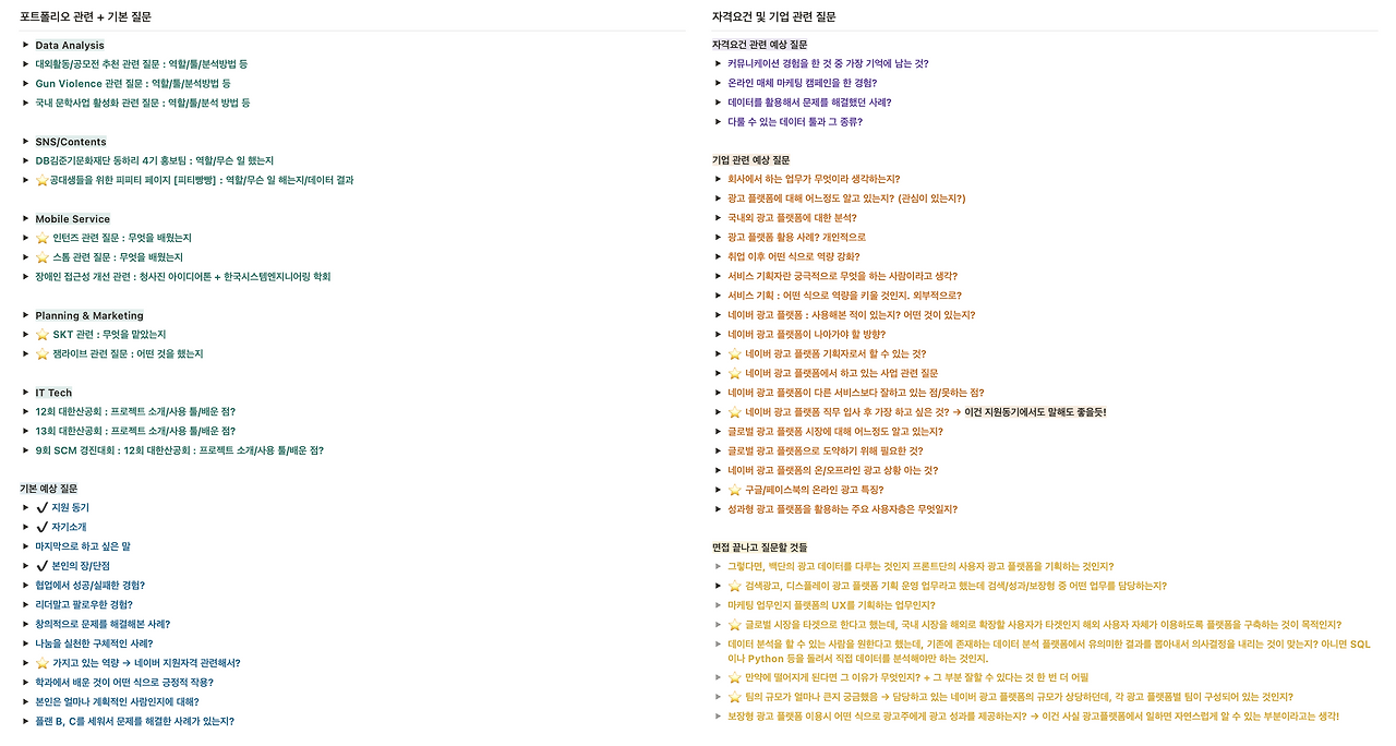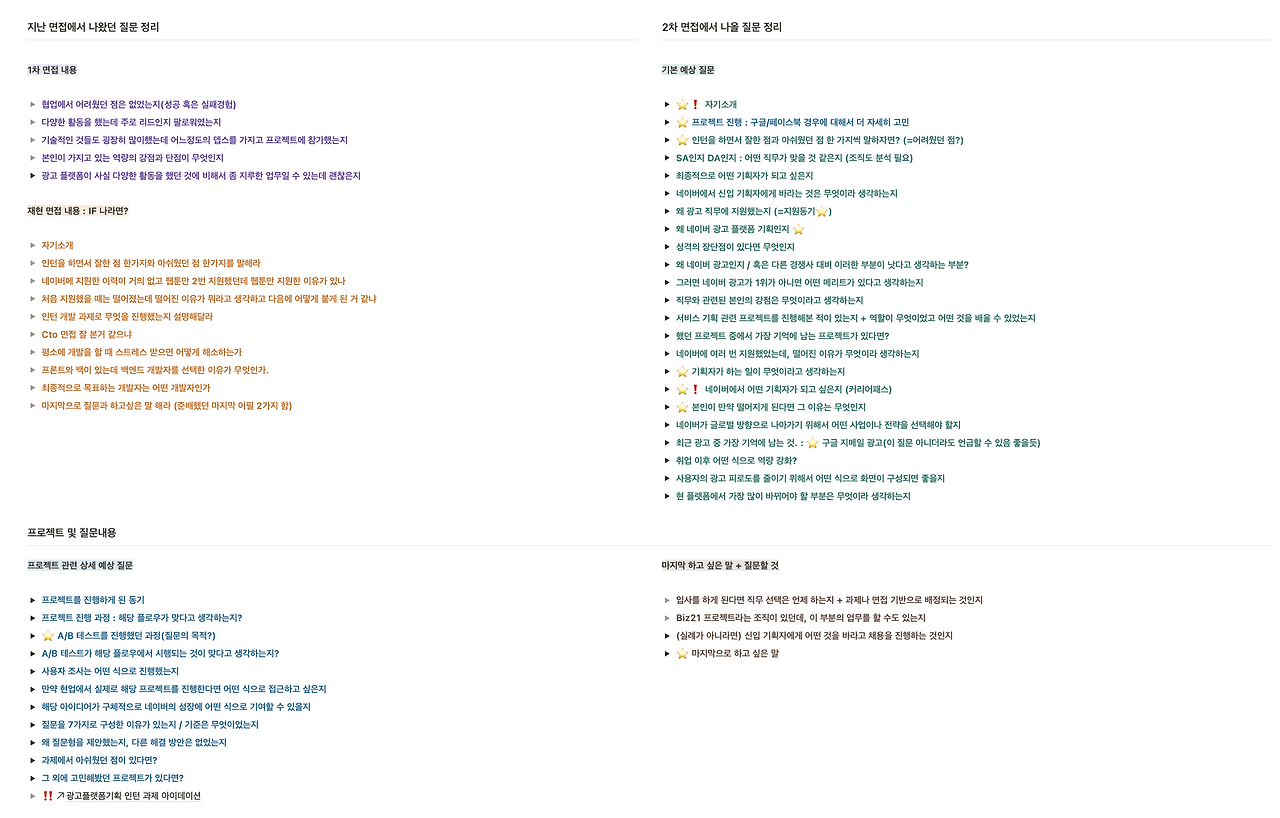 내가 가고 싶었던 기업과 직무에서 일할 수 있는 기회가 눈 앞에 있었다. 그랬기에 면접까지 남은 기간 동안 정말 후회 없이 준비해서 모든 것을 보여드리고 싶었다. 그때부터 제출했던 포트폴리오, 광고플랫폼과 관련된 내용, 그리고 과제 전형에서 답변을 하지 못했거나 더 자세히 하고 싶었던 부분에 대해서 200개가 넘는 예상 질문을 뽑아냈다. 정말 간절했고 또 간절했기 때문이다.