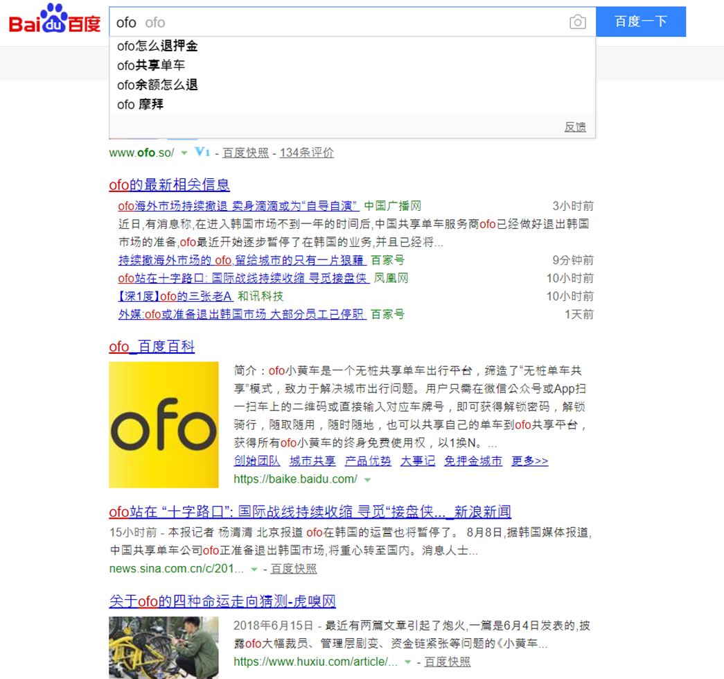내 어플 담당 지역(영미권)의 문제인지 ofo 자체의 문제인지 궁금했는데 바이두에 검색해보곤 금세 알 수 있었다. ofo까지만 쳤는데 자동으로 잡히는 검색어가... 'ofo 보증금 환불 방법' 'ofo 보증금 환불 어떻게..' 등 수많은 중국인들이 이미 궁금해한 흔적이 남아있었다. 우리나라였으면 어느 회사든 건너 건너 건너 아는 사람이 있어 마냥 웃지만은 못했을 텐데 남의 나라, 남의 일이라고 생각하니 너무너무 흥미진진했다.
