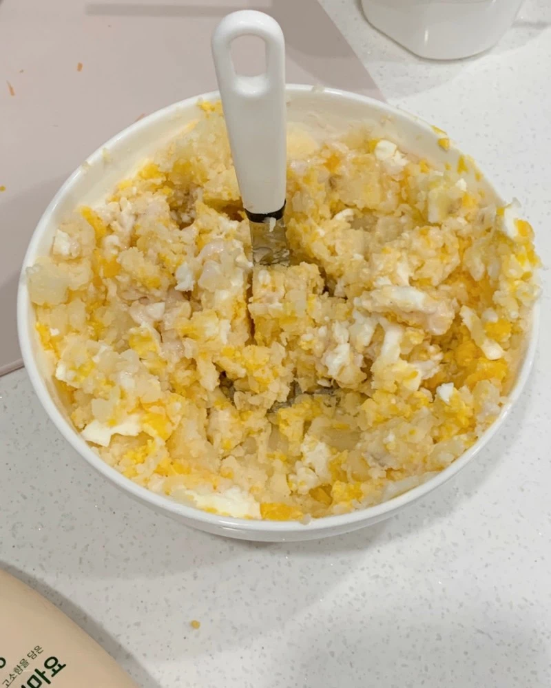 계란찜기로 왕창 쪄 낸 반숙란과 함께 사정없이 부순다. 밀폐용기에 담아서 냉장 보관하면 일주일은 거뜬한 감자 샐러드가 된다. 구운 식빵에 딸기잼 바르고 감자 샐러드만 넣어주면 맛있는 샌드위치를 만들 수 있다.