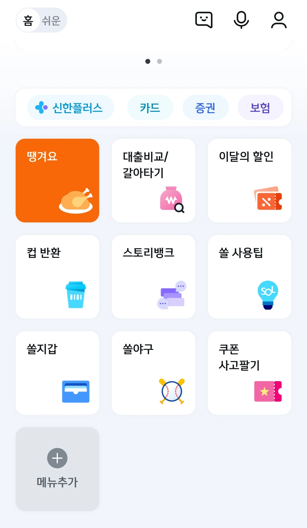 1 - 커스텀 기능 : 현재 사용자는 다양한 계좌나 카드를 많이 사용하기에 적합한 홈 화면이지만, 한 앱에서 여러 기능들로 해결이 된다면 메인 화면의 변화가 필요하다고 생각한다. 메인 화면 커스텀 기능을 추가하여, 계좌 및 카드 관리 형식을 변형하고 추가 기능(새 소식, 새 기능 알림, 고양이 키우기 등)으로 구성한다면 '자신에게 맞춘 화면'으로 더욱 많은 재접속이 일어날 것이라 생각한다.