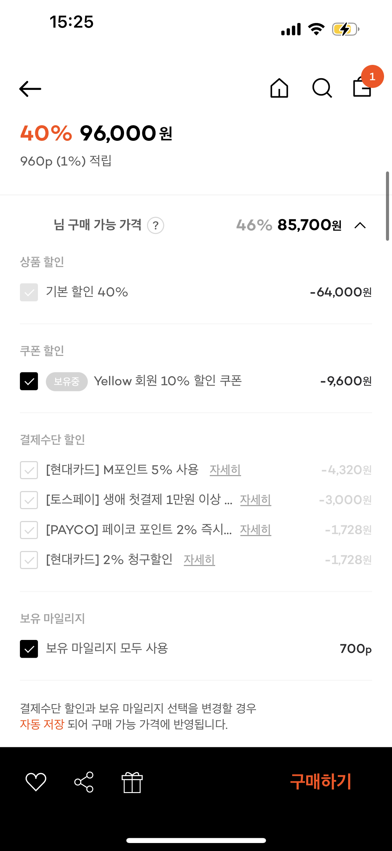 다만 '장바구니'를 통한 구매 시에는 결제 페이지에 적용되지 않고, 즉시 구매할 때에만 적용이 된다는 점이 아쉬웠다. 장바구니에 넣고 미결제 상태에서 이탈하는 사용자를 잡거나, 하나의 상품만 구매하는 사용자 데이터를 통한 기능일 가능성이 존재한다. 하지만, 결제 페이지에서도 바로 적용하는 기능으로 사용성을 높일 수 있지 않을까?